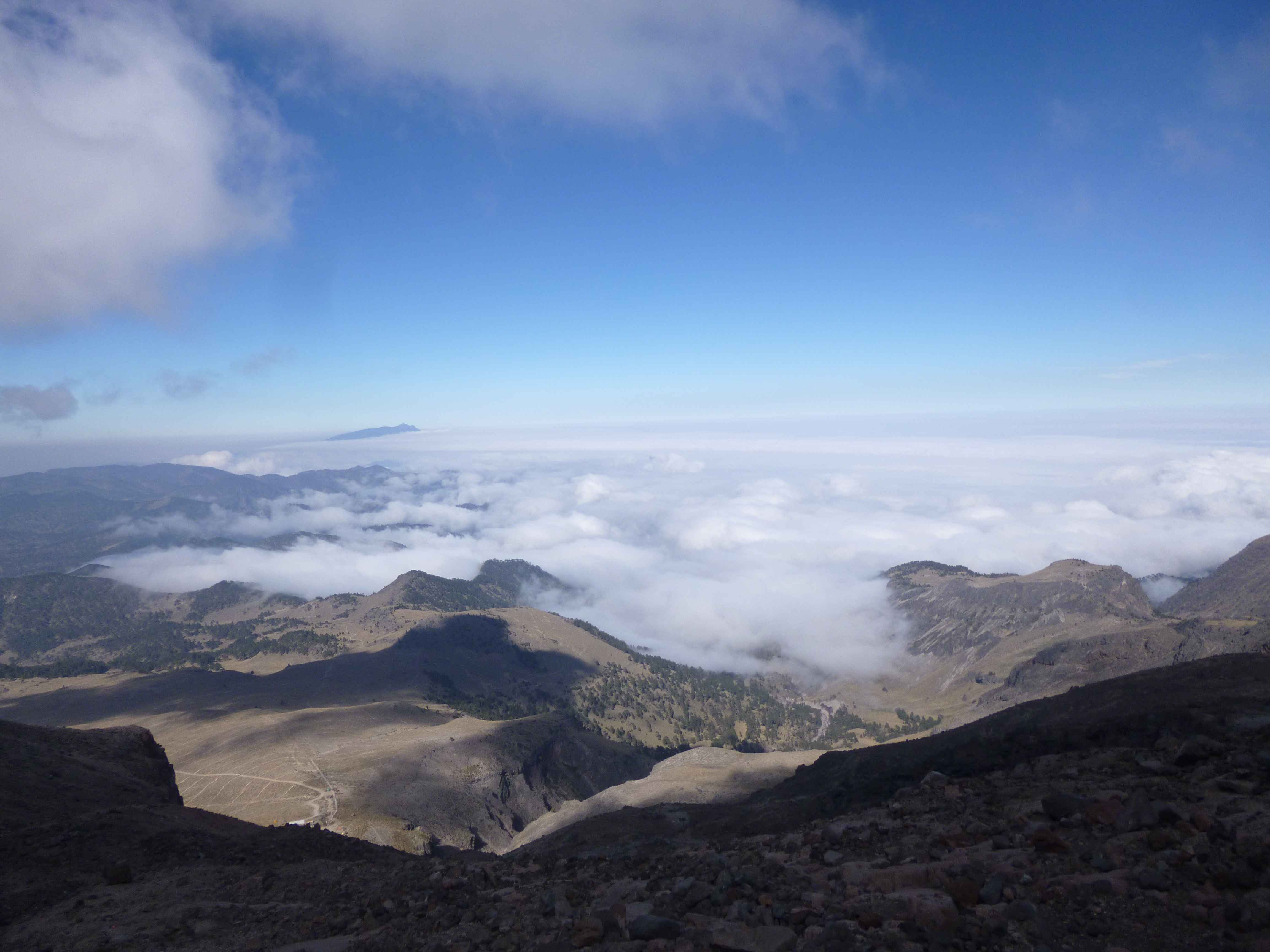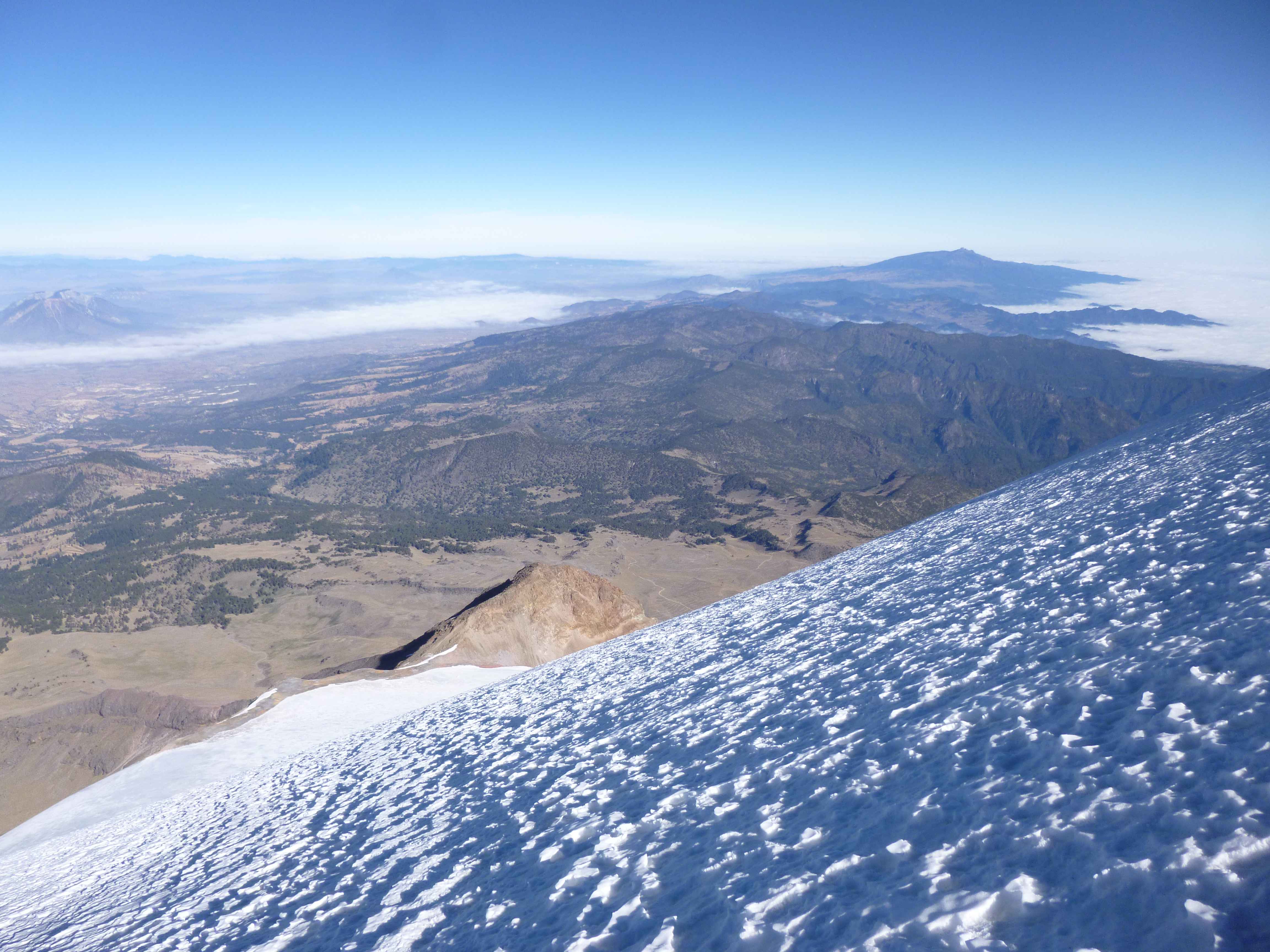 The air was clear enough for me to make out 5230m Iztaccihuatl and 5426m Popocatépetl. Popocatépetl, an active volcano, was emitting small plumes of smoke. It was really neat to see these mountains from Orizaba, as I had climbed Iztaccihuatl earlier in the week and enjoyed numerous, clear views of Pico de Orizaba along the way.