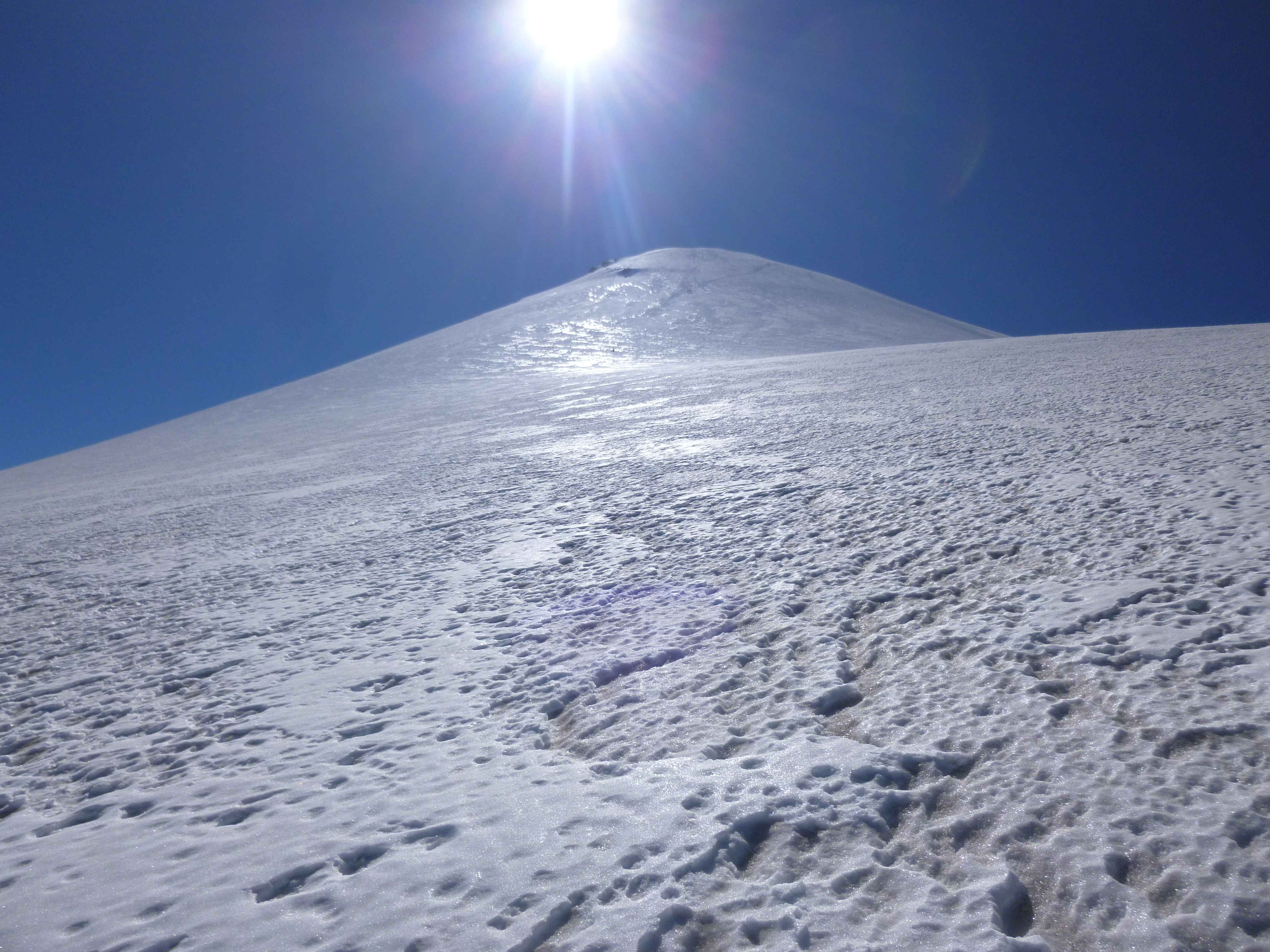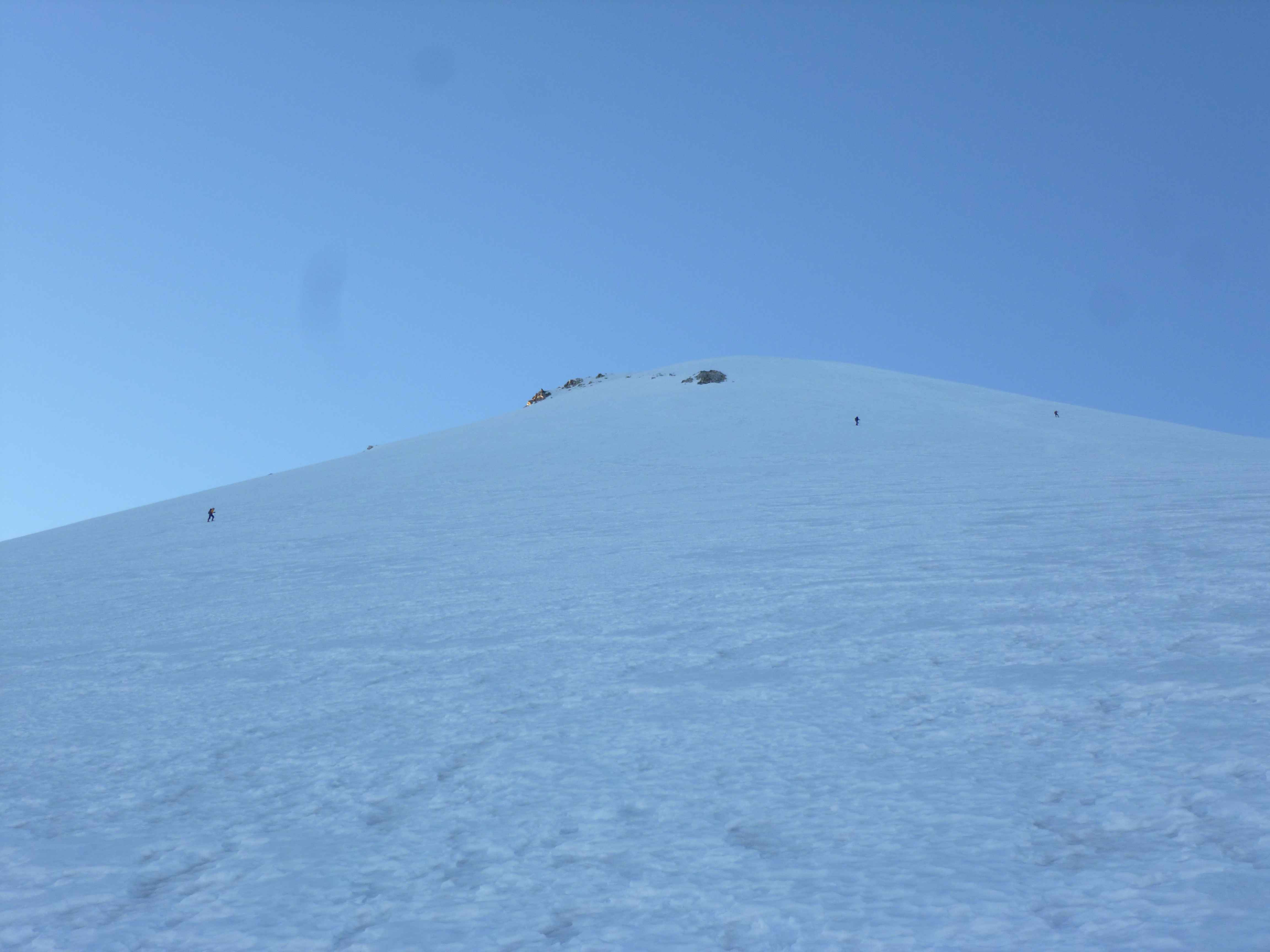 Near the top, the glacier was roughly 35-40 degrees at its steepest. The snow condition was fantastic, and made for sturdy, enjoyable climbing.