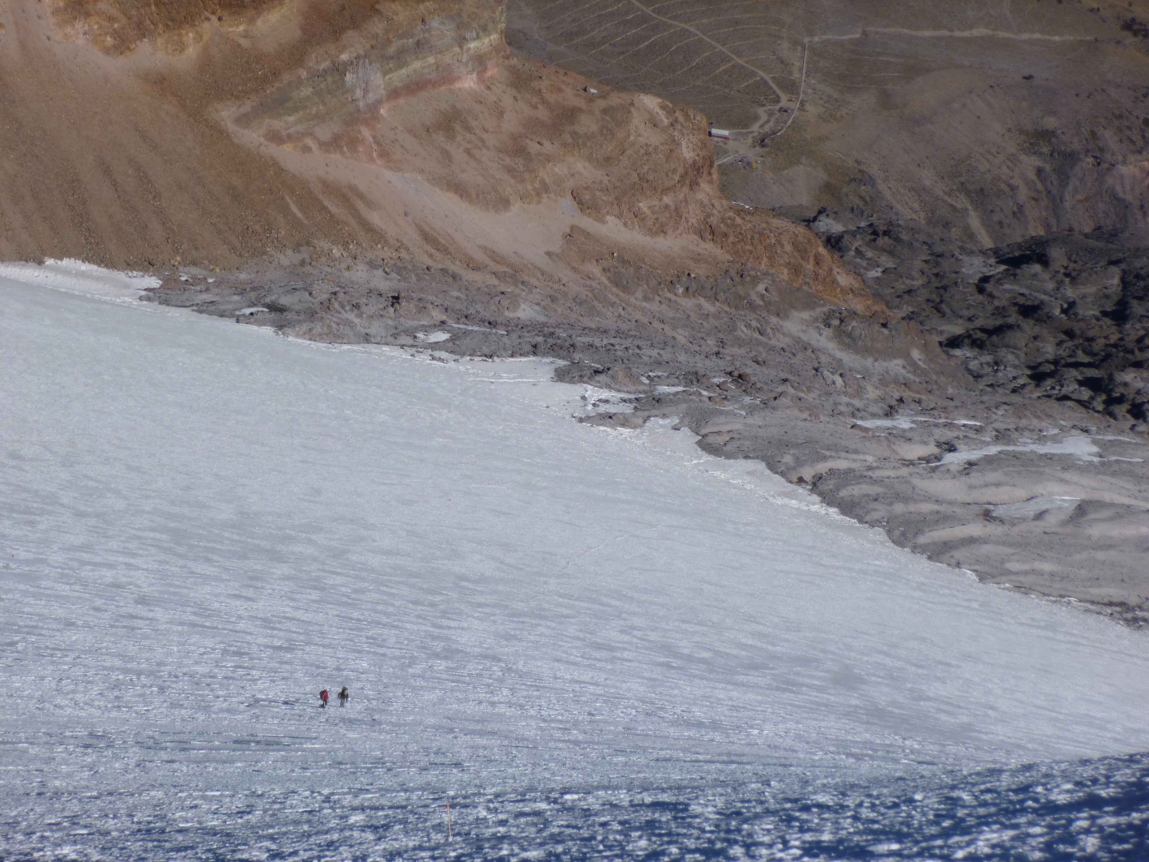 Looking down the glacier. The Piedra Grande hut is visible in the top right corner. The British/Mexican pair are heading up.