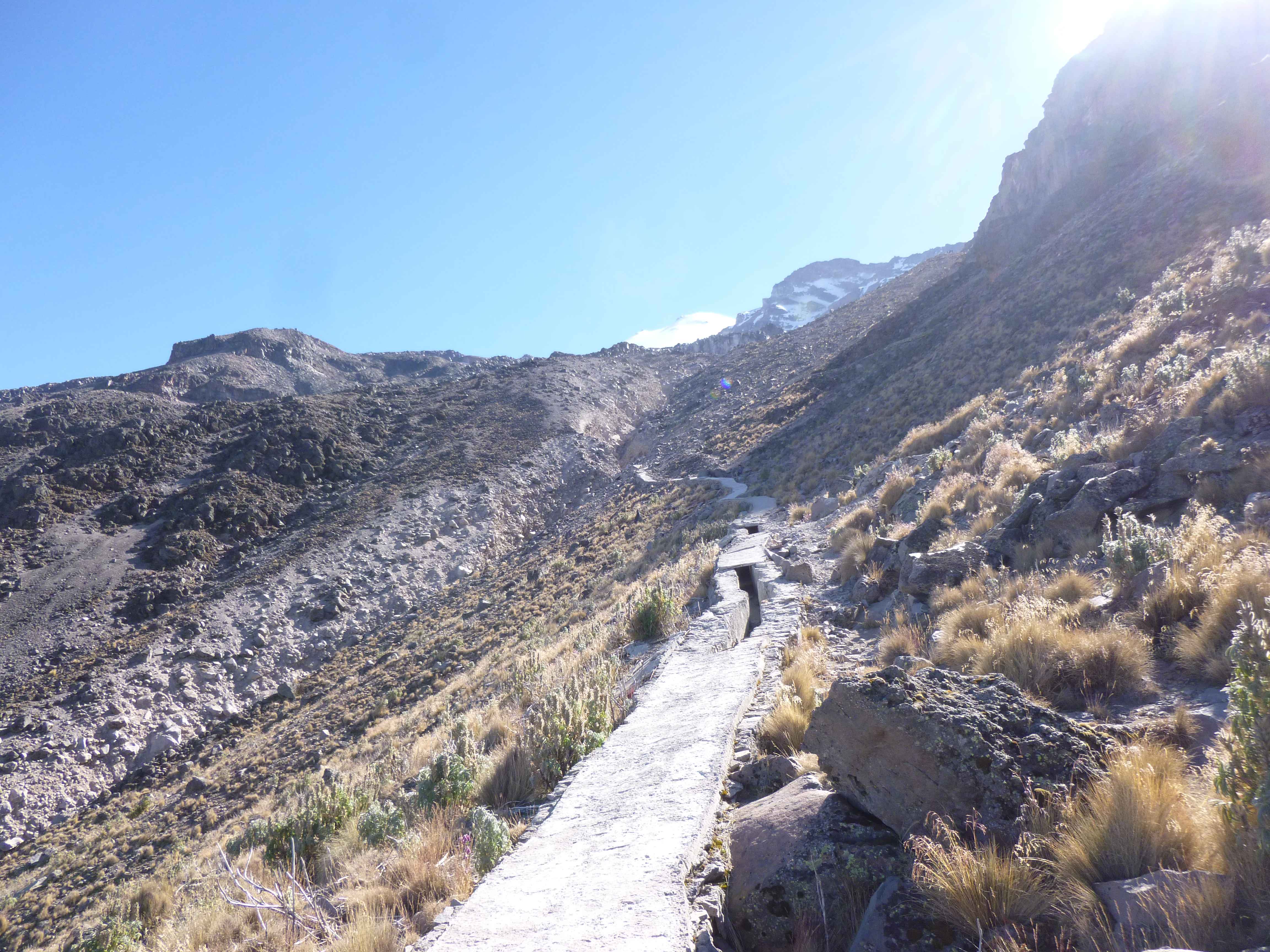 From the Piedra Grande hut the route begins by following an old drainage aqueduct before heading up through a moraine of loose scree.