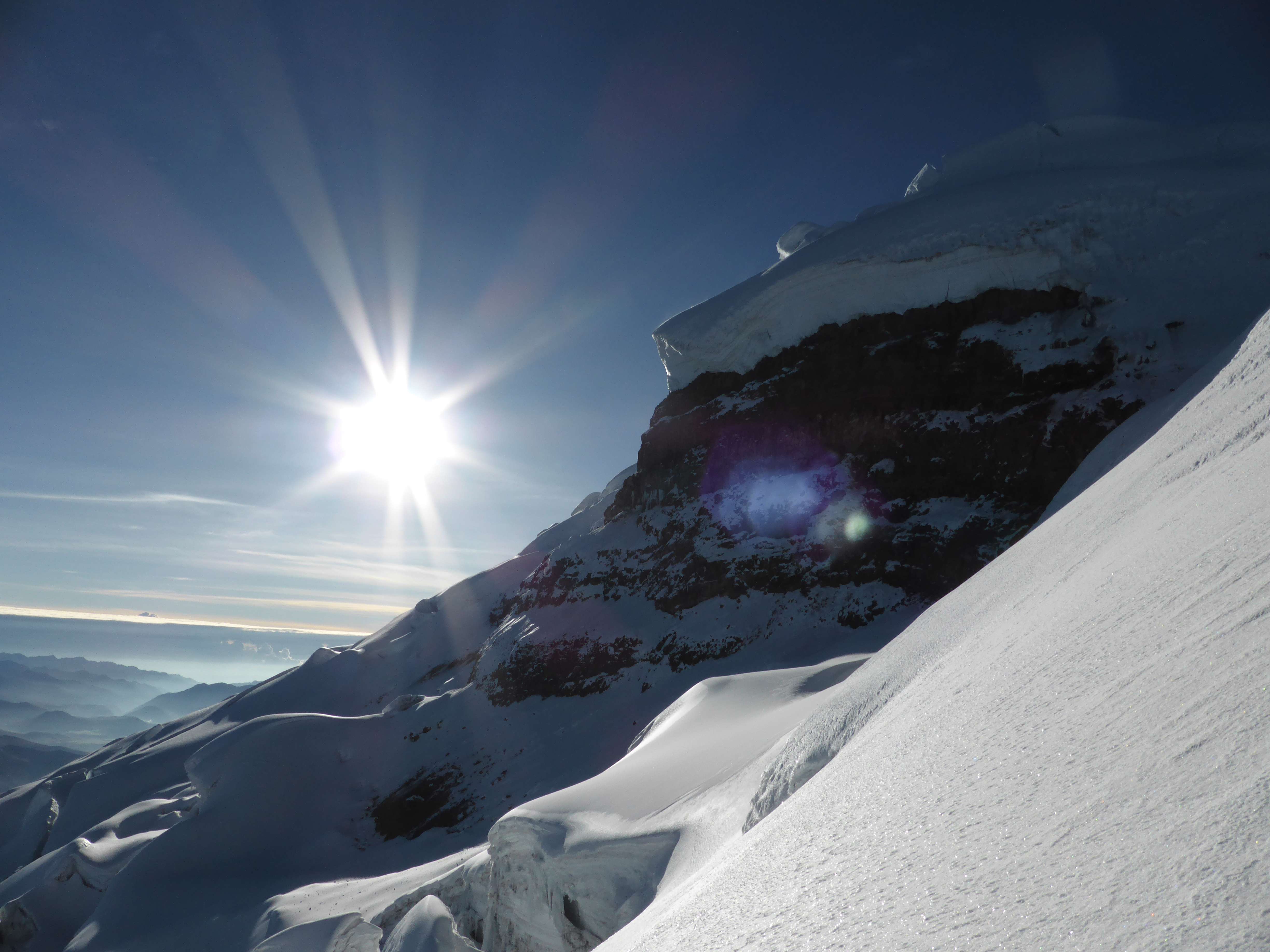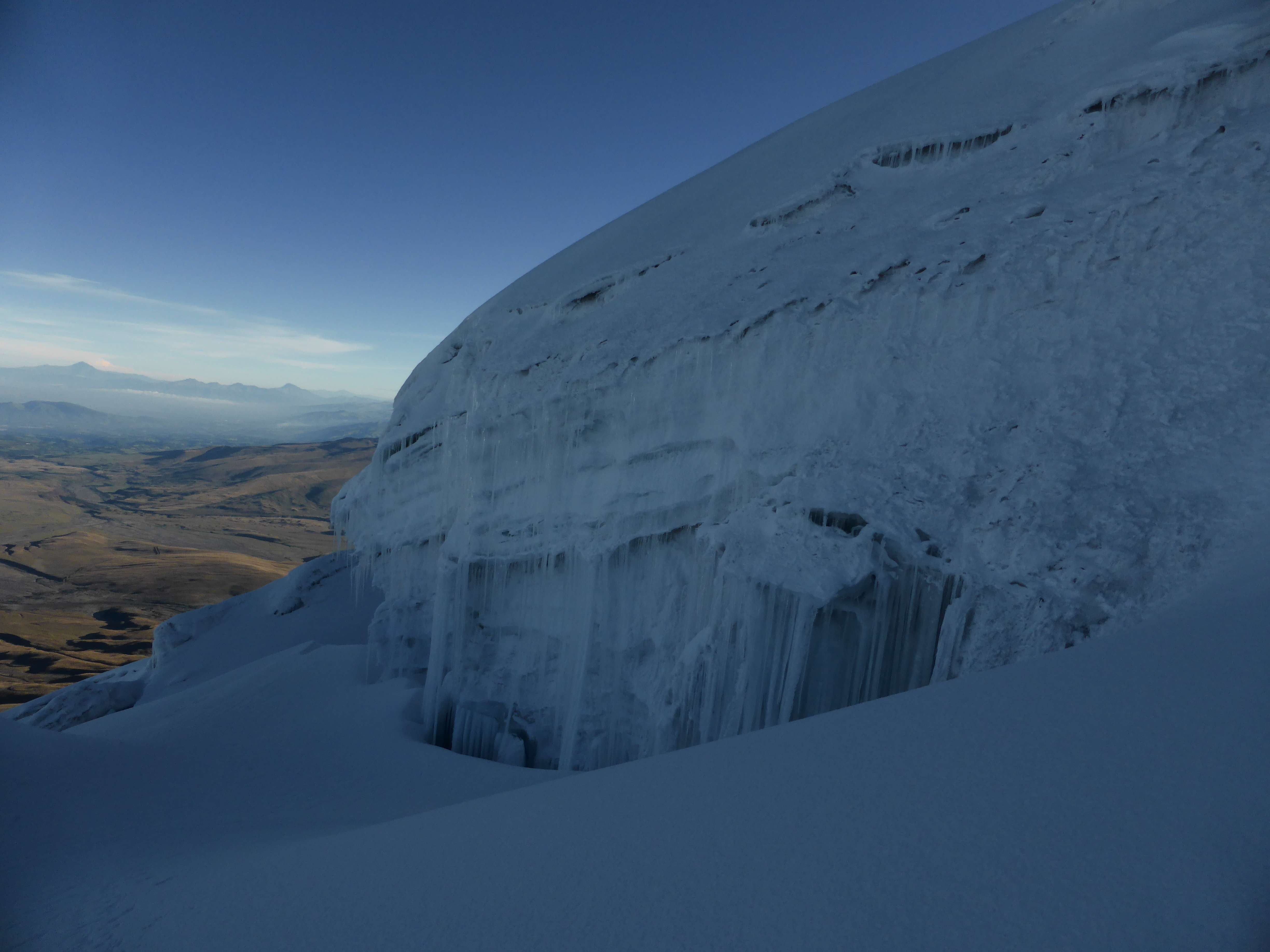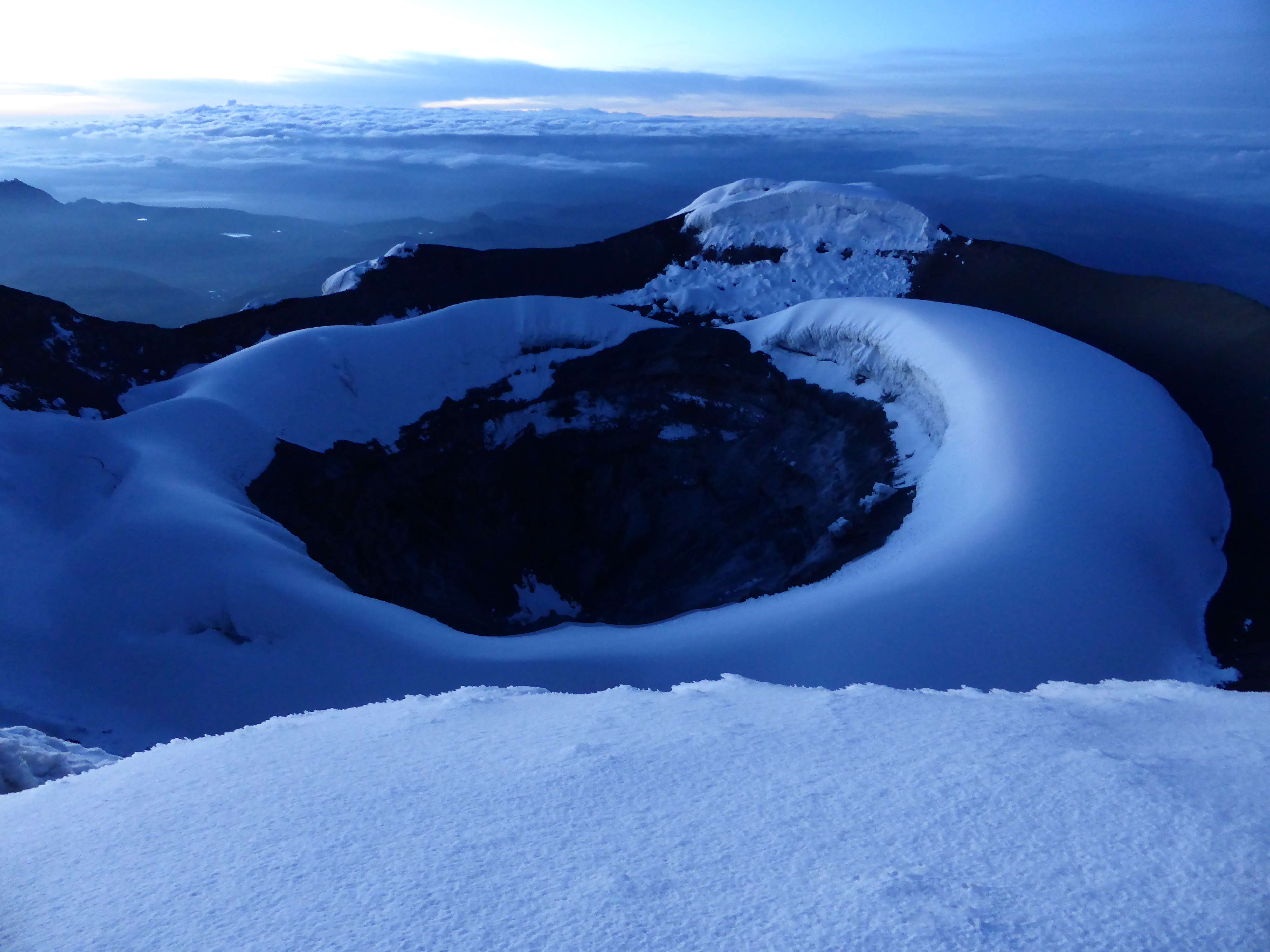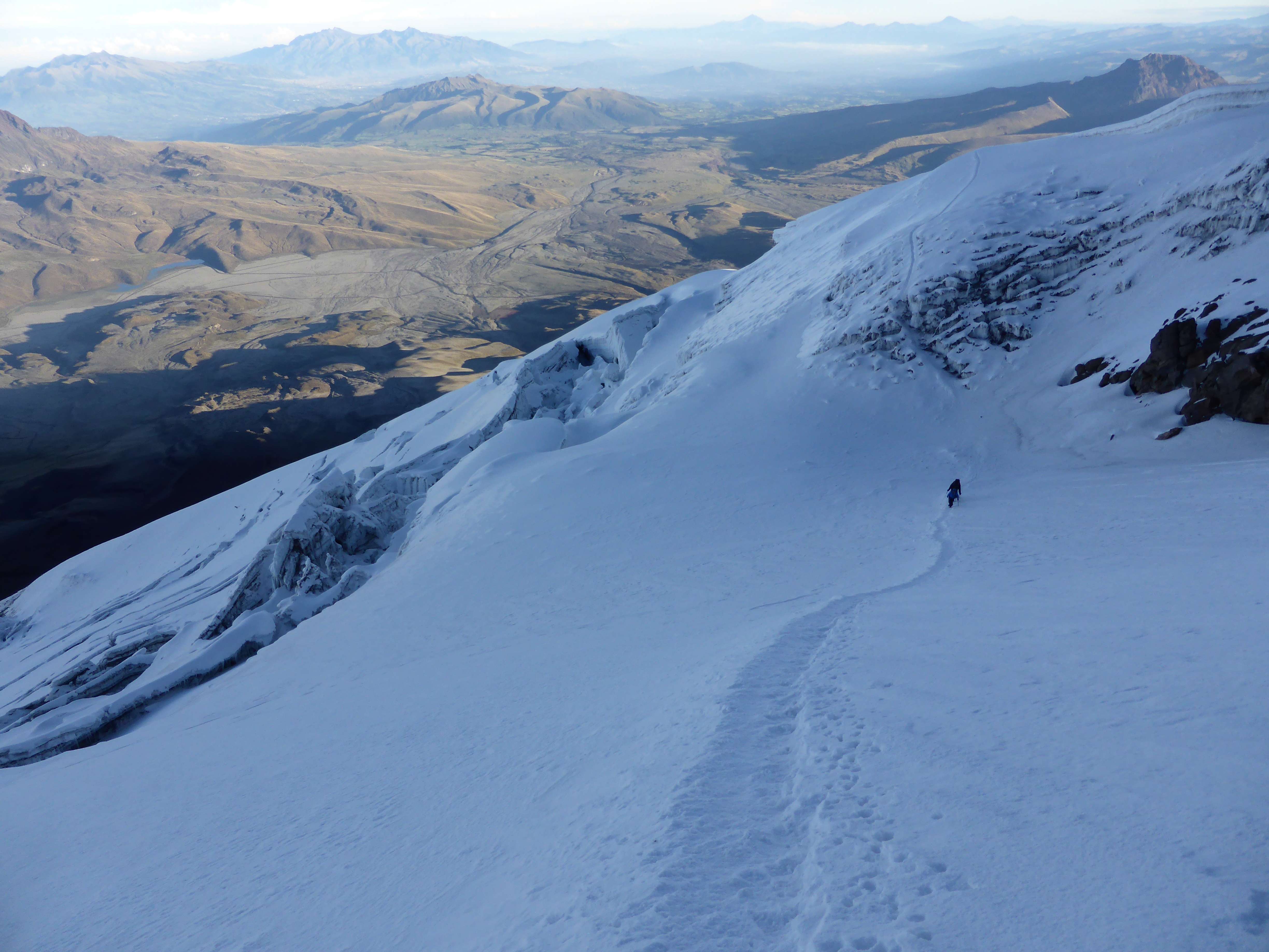 The route was easy to see and follow due to a well-trodden boot track produced by the hundreds of climbers who had ascended this way before us in the days or weeks since the last snowfall. Unlike Cayambe two days prior there were no difficulties presented by route finding or crevasse navigation. While numerous, enormous crevasses lurked off-route, none were open in our path.