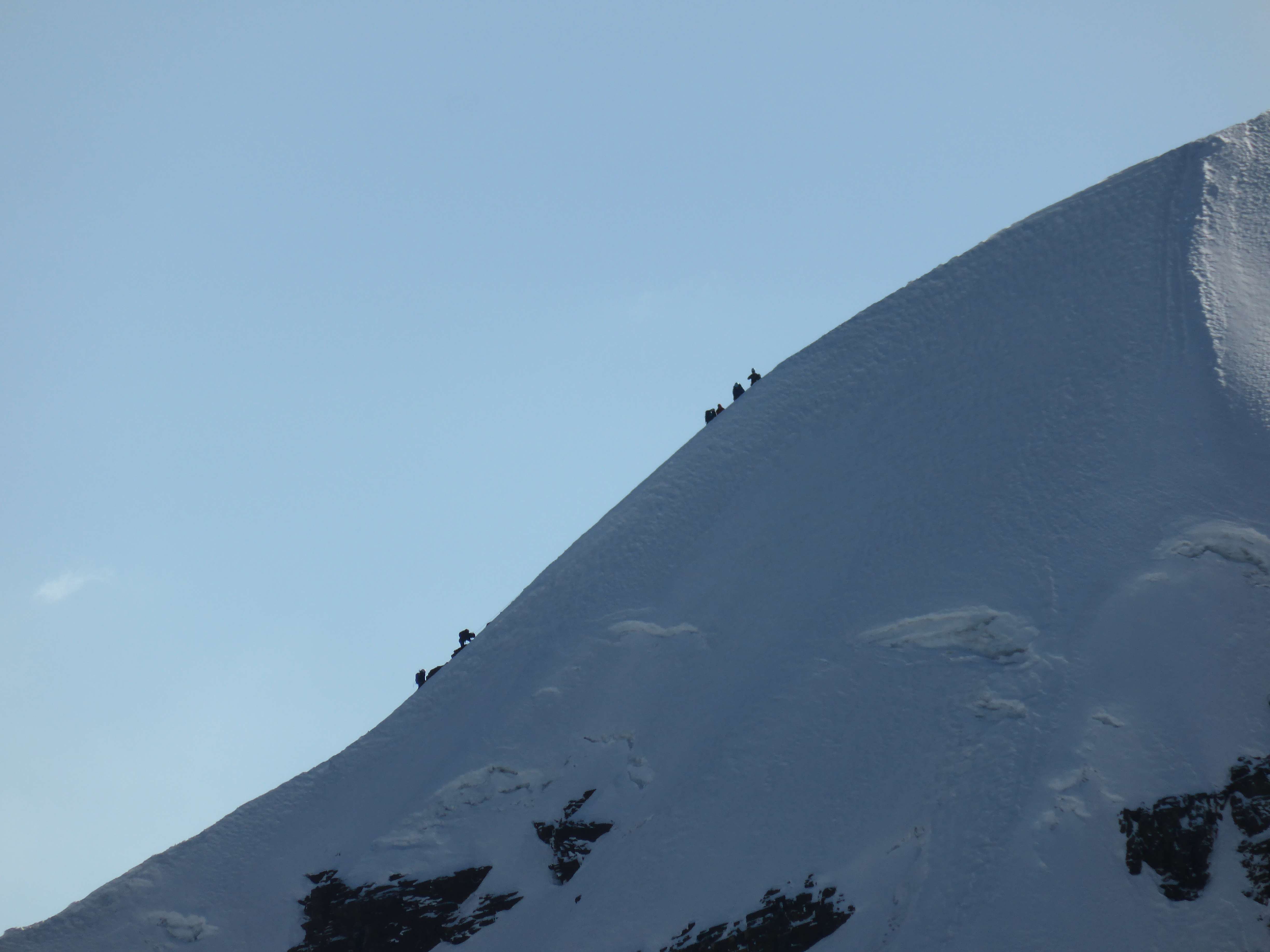 At the base of the summit ridge, getting ready to cross one final crevasse.