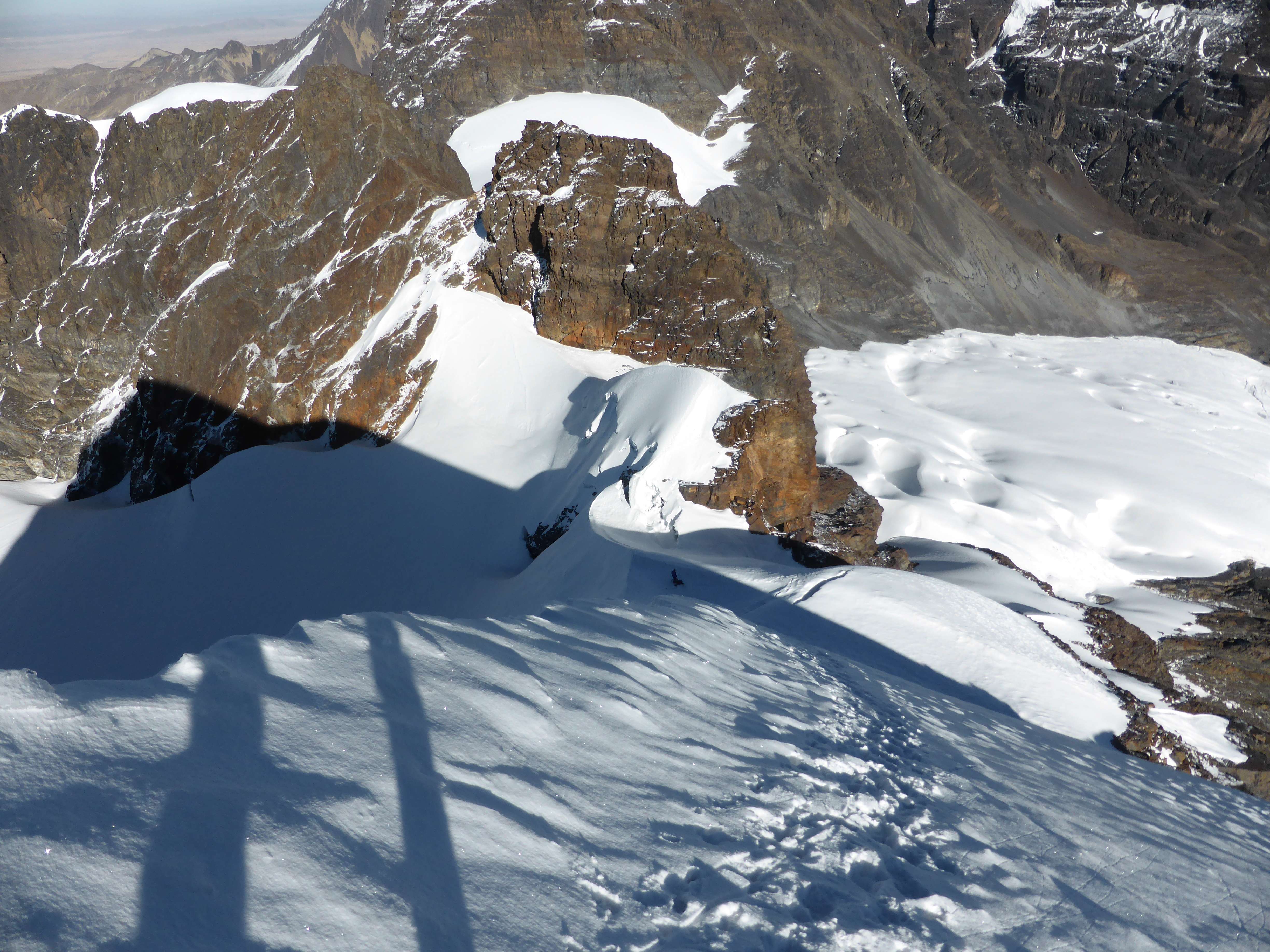 We down climbed most of the way, but used a single rappel to get past the steepest middle section of the ridge.  Our descent was fast, yet trickier than the ascent.  From the base of the summit ridge we crossed back to Tarija peak, scrambled back to the top, and began the long trudge back down the main glacier and to basecamp.