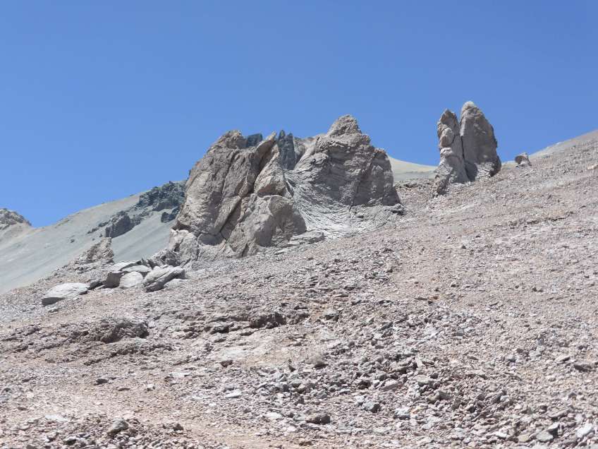 Aconcagua071 Published 2015/03/12 at 4896 × 3672 in Aconcagua, Photographs – February 2015 The Conway Rocks, a distinct landmark on the way to Camp Canada.
