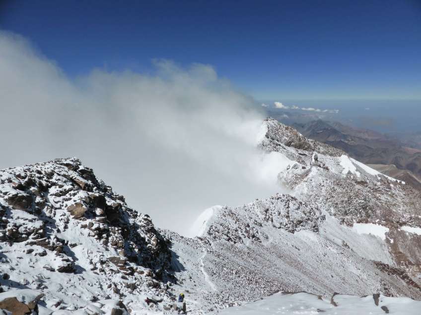 Aconcagua125 Published 2015/03/12 at 4896 × 3672 in Aconcagua, Photographs – February 2015 The Guanacos Ridge connecting the north and south summits. Nicolas Miranda and Karl Egloff can be seen ascending at the bottom-center of the picture.