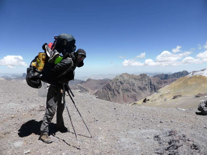 Aconcagua133 Published 2015/03/12 at 4896 × 3672 in Aconcagua, Photographs – February 2015 Prepared for the final descent from Nido de Condores, loaded with garbage, waste, gear, and leftover food.