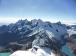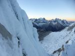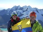 I had heard from an Ecuadorian climber in Kyrgyzstan, and others in Huaraz, that the French Direct route was in great condition this season – and we weren’t disappointed.  Gaining the face involved a big move onto overhanging snow above the bergshrund, which Edgar led in style, and seconding it clean felt burly and strong.  Pitch 1 above the bergshrund was a moderate snow slope of around 55-60 degrees, with each subsequent pitch getting progressively steeper and icier.  The climbing was sustained, but the snow condition was firm and crisp – tooling and frontpointing upwards felt delightfully secure and fun.  This being the longest pitched snow route I’d ever undertaken, at eight 50-60m pitches, I focused on my stamina, controlled my breathing, and tried to move carefully and efficiently up the face.  Around Pitch 5 I realized that we were roughly halfway up and were going to make it to the top; this sense of impending success fuelled the remaining three pitches.  Pitch 8, the last, was rock hard 75-80 degree water ice riddled with pockets, large swathes of it thinly plastered over rock.  A final crux above the ice involved a few balance moves onto the summit cornice – and we were on top!  The German team followed onto the summit directly behind us, and were very friendly despite having had to climb below us (and all the ice chunks we knocked down) for the entire route, and wait for us to sort out some rope tangles below the final ice pitch.