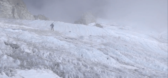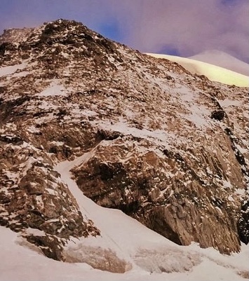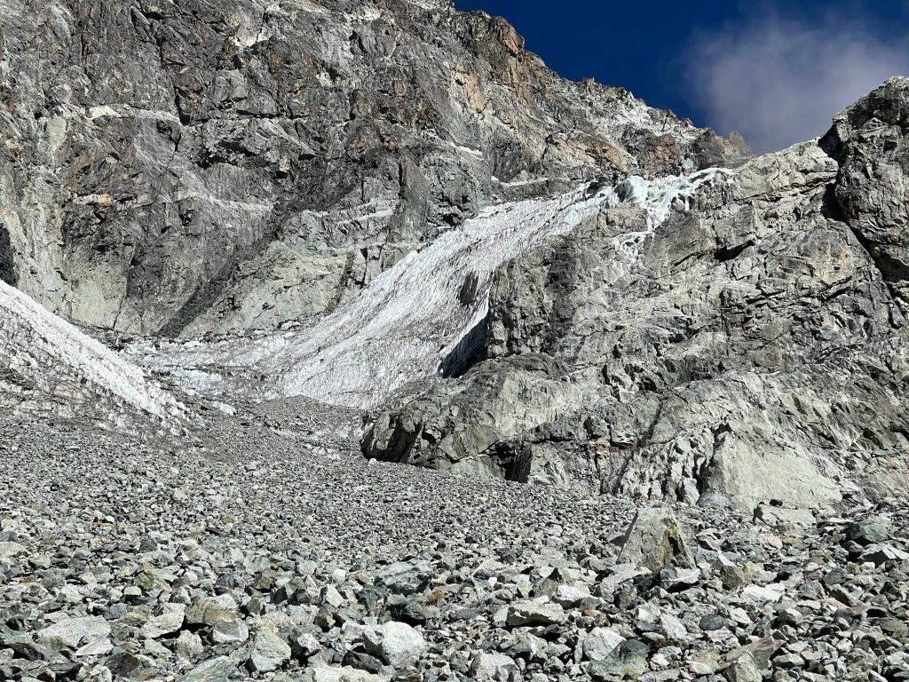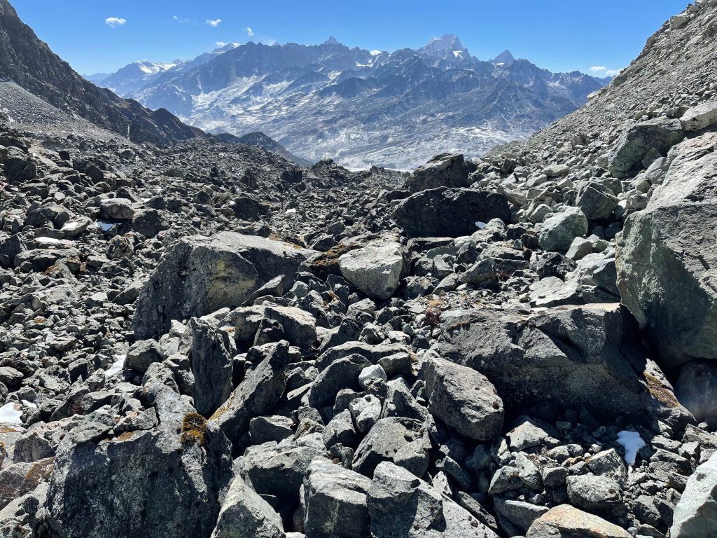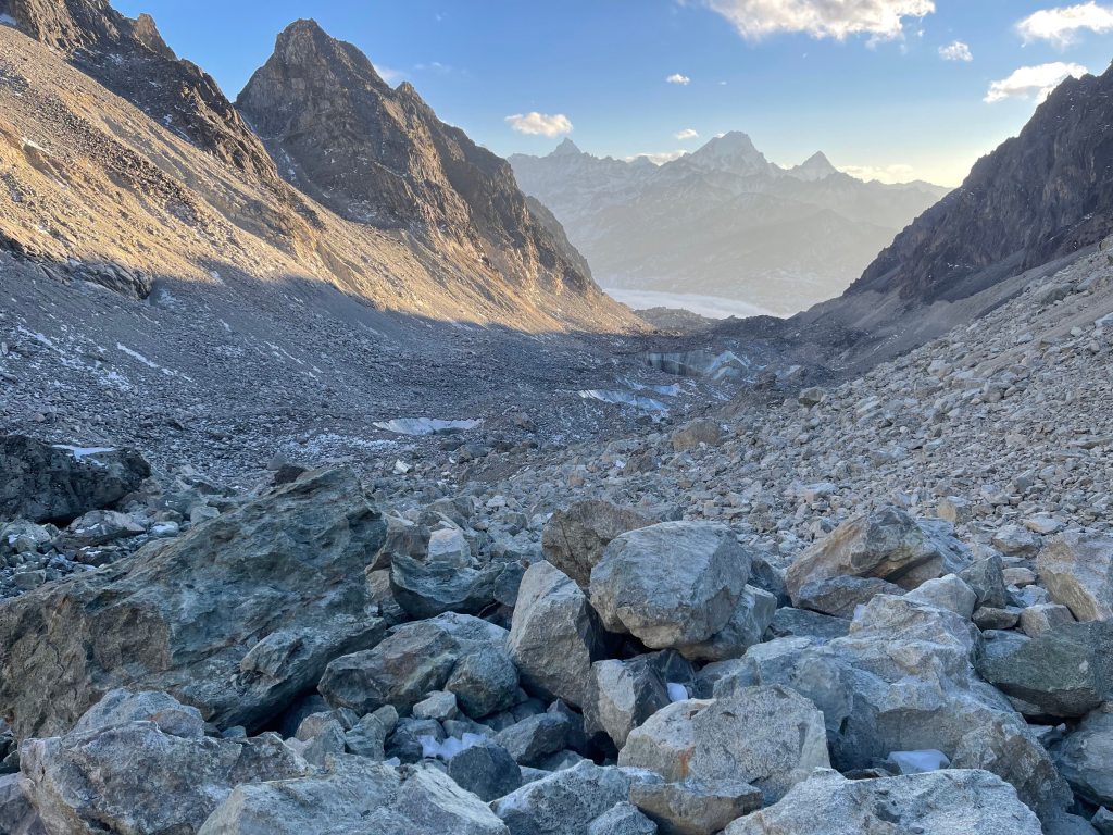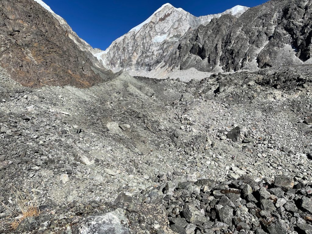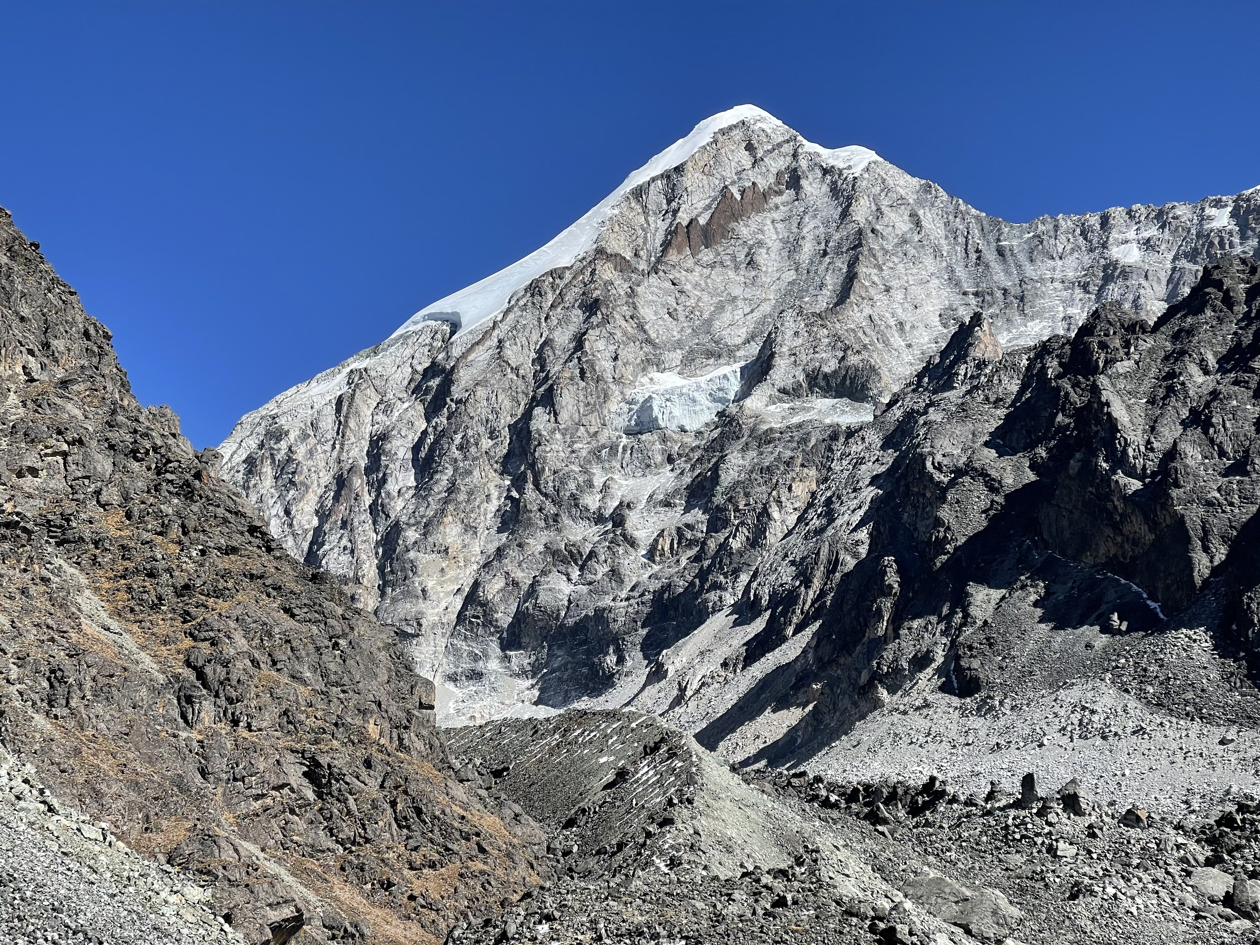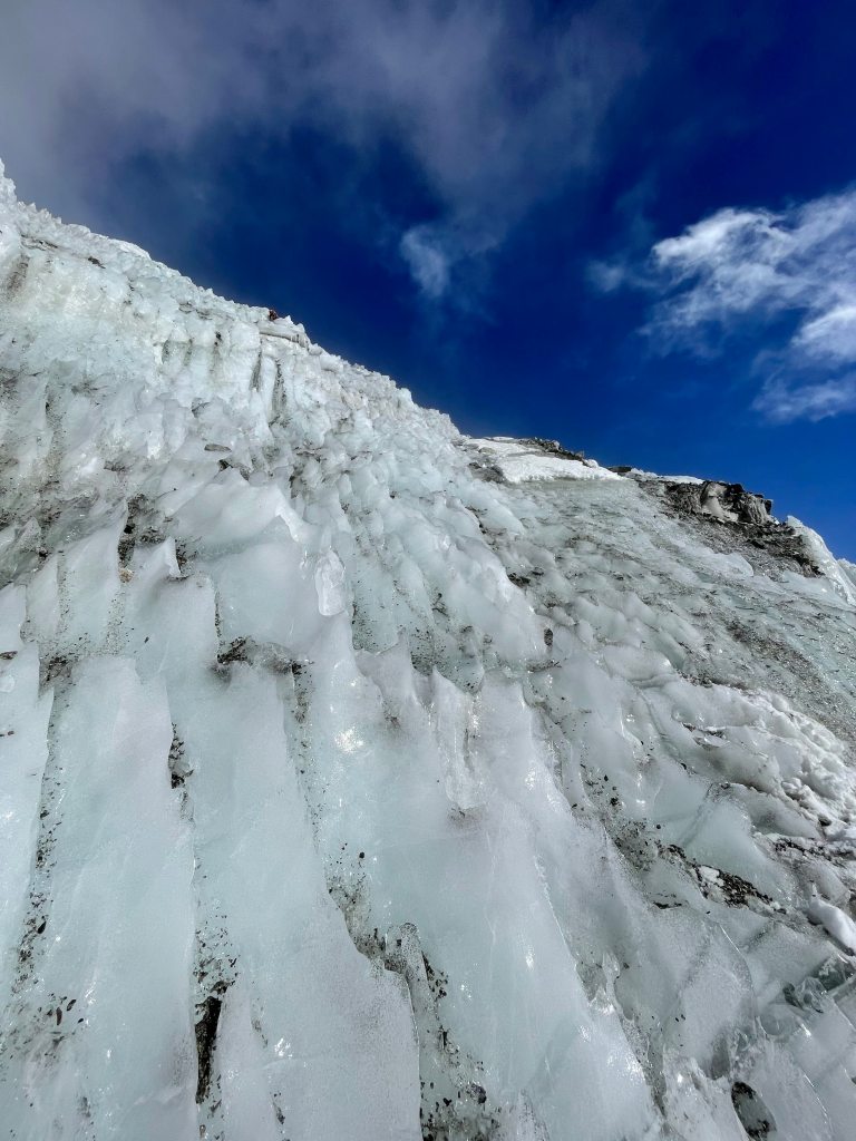 When we reached the gully which gains the toe of the glacier, we discovered poor conditions on the mountain. There was no snow cover to speak of, and the glacier access at 5000m which we had expected to involve a straightforward snow ramp instead presented us with around 60m of 50 degree blue ice, which we gingerly simul-soloed. Where the approach up the upper valley had involved exposure to easily avoidable rock slide, the gully which gained the glacier created a dangerous, bottle-necked shooting gallery. We had at least a dozen near misses within 1m of us, from rocks softball sized or larger, and my partner took a significant hit to the upper arm while protecting his head with it. While we were on descent in full shade a murderous block the size of a microwave hurtled down the gully towards us, spinning like a throwing axe as it bounced and careened some 10m off of the ground – and this was the final straw for me.