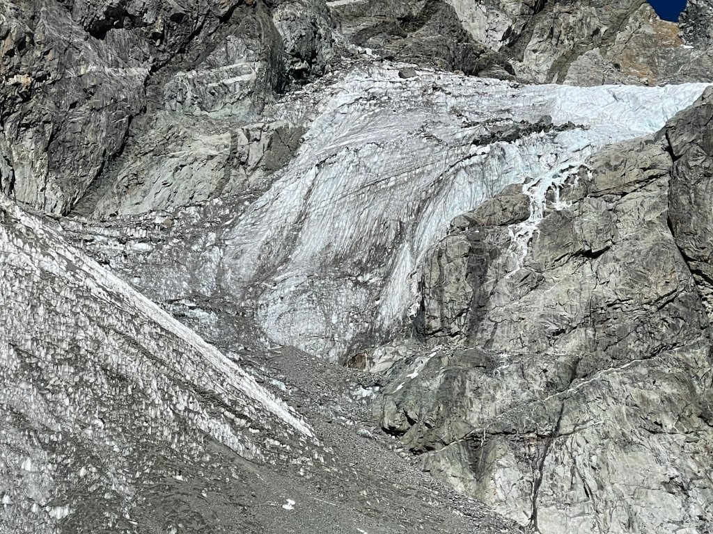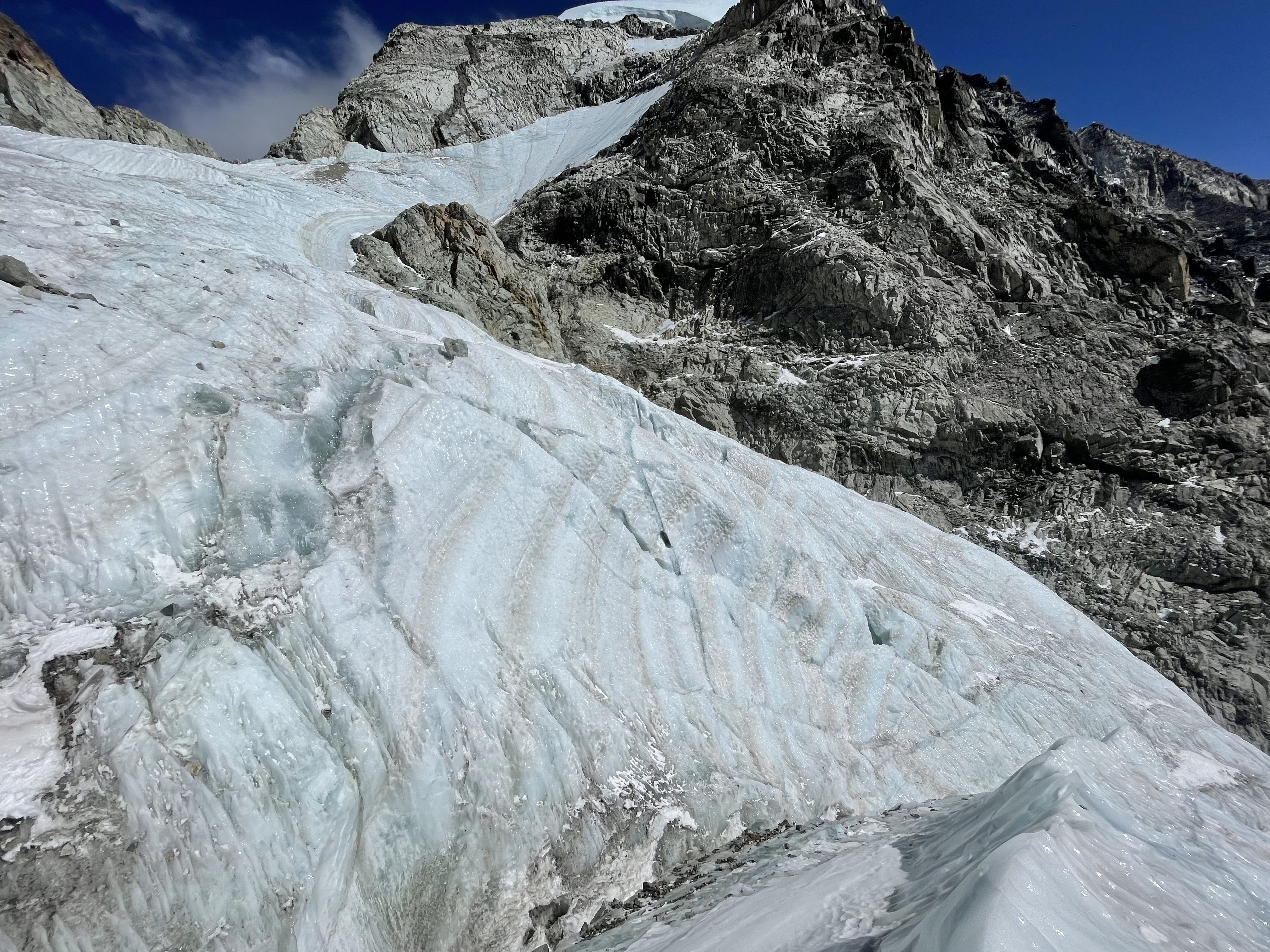 Without snow cover the bone-dry glacier had also receded from key technical steps along the route. The dry glacier created tens of meters of bare rock and significant ice runouts where our research had led us to expect easy to moderate snow slopes and two or three 2-3m steps of rock and ice. I reviewed my photos of the upper mountain in basecamp, which revealed that the entire 600m of gain to the top, over 1km of summit ridge, was also made up of exposed blue ice. Realistically, even without the unacceptable risks of persistent rockfall, our 30m rope and four ice screws were inadequate for safely dealing with such extended climbing on 45 degree ice atop an exposed ridge. A running belay on screws could have gotten us much higher than our turnaround at 5350m, but a safe descent would have been nightmarish. We made the decision to end our attempt and retreat due to the objectively hazardous rockfall, and the knowledge that a summit was most likely beyond our ability given the state of the glacier.