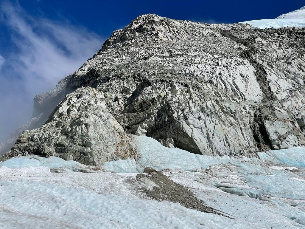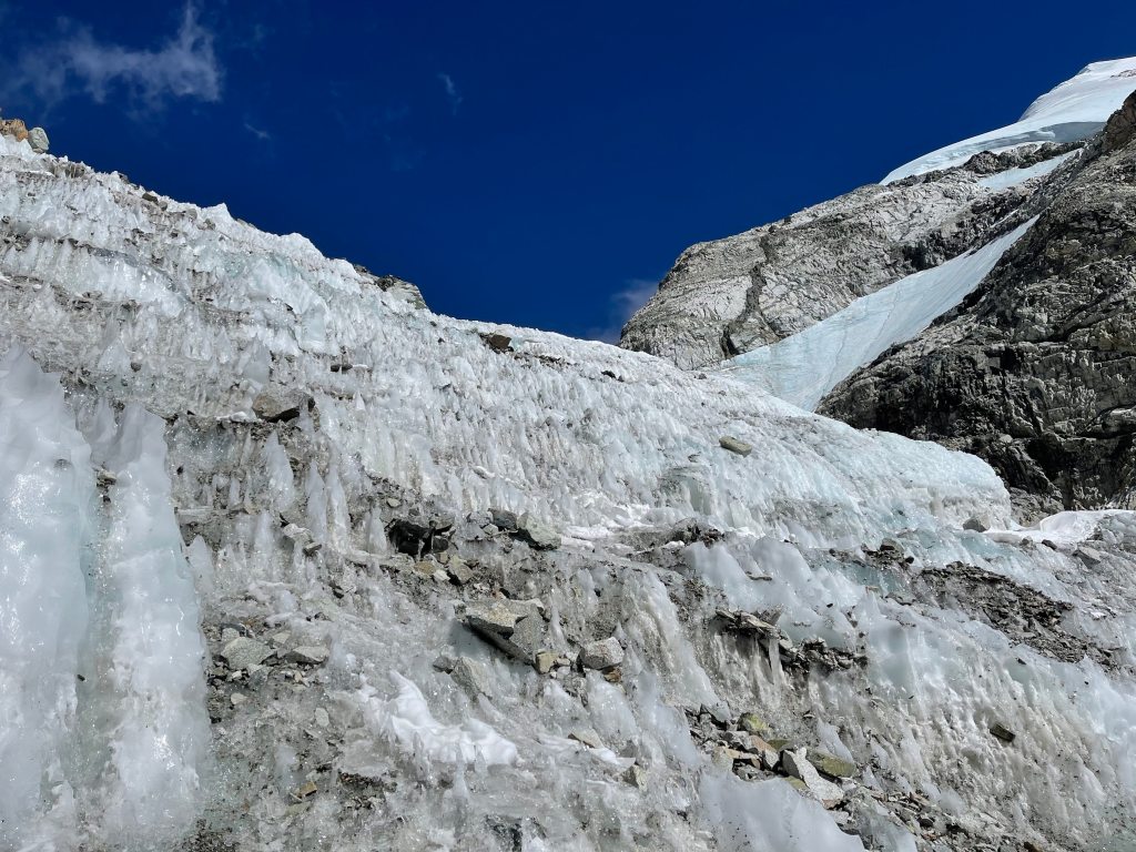 I been warned in advance of rockfall on the route by my helpful contact in the Sichuan mountaineering association, but had not anticipated the degree of risk which we experienced. We encountered sustained rockfall dramatically worse than anticipated, made particularly bad by conditions on the mountain and in the valley; there had been no significant snowfall for months. The same dry conditions which created forest fire hazards lower down made for a glacier of naked blue ice, and for very little snow anywhere on the mountain. High winter winds that cleared away any remaining snow cover further exacerbated this inclement terrain. As a result, rocks perched atop or embedded within the surface of the exposed ice rained down nonstop, knocked free by winds or the daily thaw/freeze cycle.