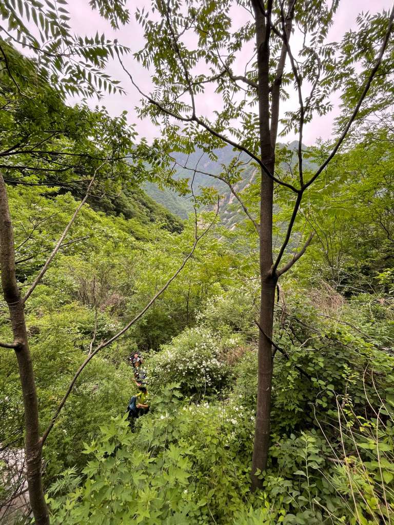 Our climb began with a delayed flight from Shanghai to Xi’An, the provincial capital of Shaanxi.  Shaanxi is known for the Terracotta army excavation, for the ancient city walls of Xi’An, and for Hua Shan.  Hua Shan, one of China’s five holy mountains, is a touristic granite peak accessible by cable car and frequently painted in watercolor as a symbolic representation of China’s cultural landscape.  Nearby Xi’An are rural valleys walled by impressive mountains of sheer granite with an elegant aesthetic to rival that of more famous Hua Shan, but undeveloped for tourism.  Eggplant Mountain stands deep within one such valley, past a large hydro dam. Because of the dam infrastructure, the road in is only accessible by road after 6:30 p.m.; we were able to access the road early by contacting a local villager in advance for permission.  The beginning of the roadside approach hike to Eggplant mountain can be found at coordinates 33.95422, 109.11861.