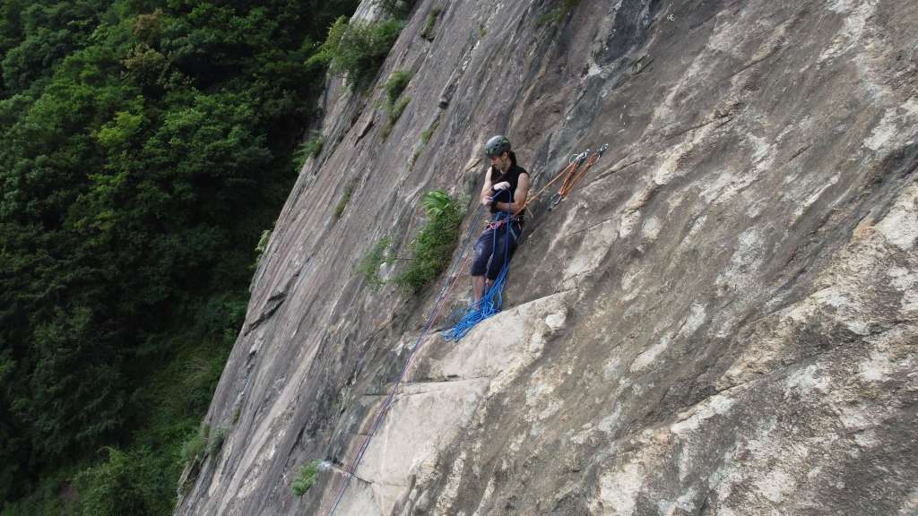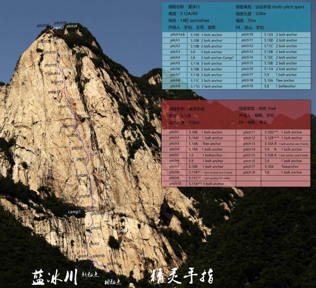Blue Glacier, a peculiar name for a rock route covering hundreds of metres of golden granite slab, is one of two routes on ~2200m Eggplant Mountain, the other being Elf Fingers 精灵手指, a seldom-climbed trad line.  The routes were opened in 2016, and are perfect representatives of the wonderful growth in mountain sports and related development which has taken off in China.  Blue Glacier covers 520m over 19 pitches, and goes at 5.12a/A0.