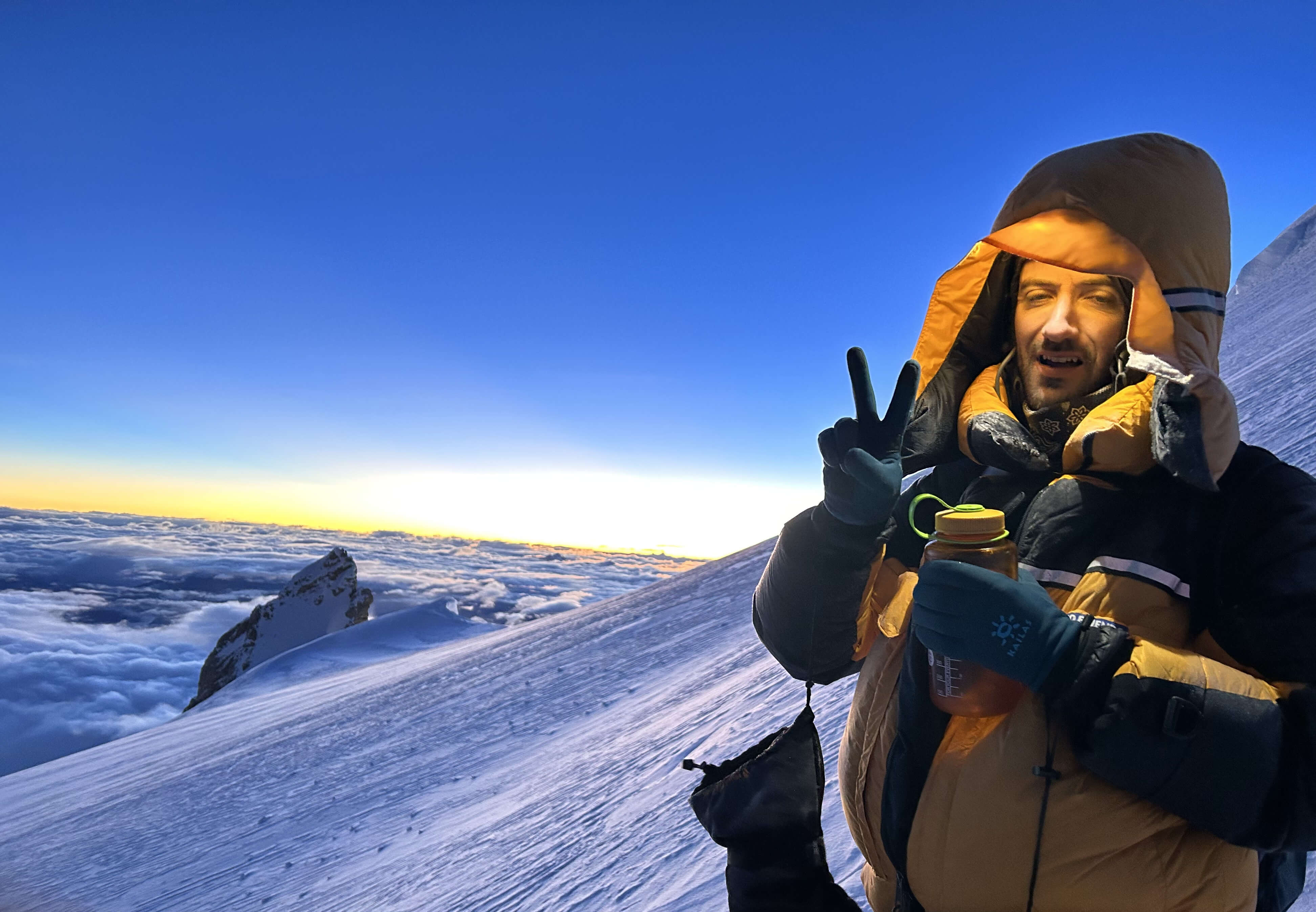 On the way down from the summit I sat down to rest at around 7600m and vomited until my stomach was knotted empty.  Between C4, the summit, and my return to basecamp I consumed nothing but Coca Cola, Honey Stinger energy gels, a cup of juice generously provided by Nims Dai’s team at Camp 1, and a litre of water mixed with Cyclic Dextrin carbohydrate powder – a gift from my partner Reuben on Pik Kommunizma.  Feeling far from spent after summiting, Pa Dawa and I decided to descend all the way to 4900m basecamp in one push.  We knew that the food, sleep, and general environment of basecamp would be far preferable to another night at a high camp, and worth the exertion of a big descent.  We ended up completing the ~3200m descent in approximately 9 hours. The descent was long and arduous, but we moved with high spirits.