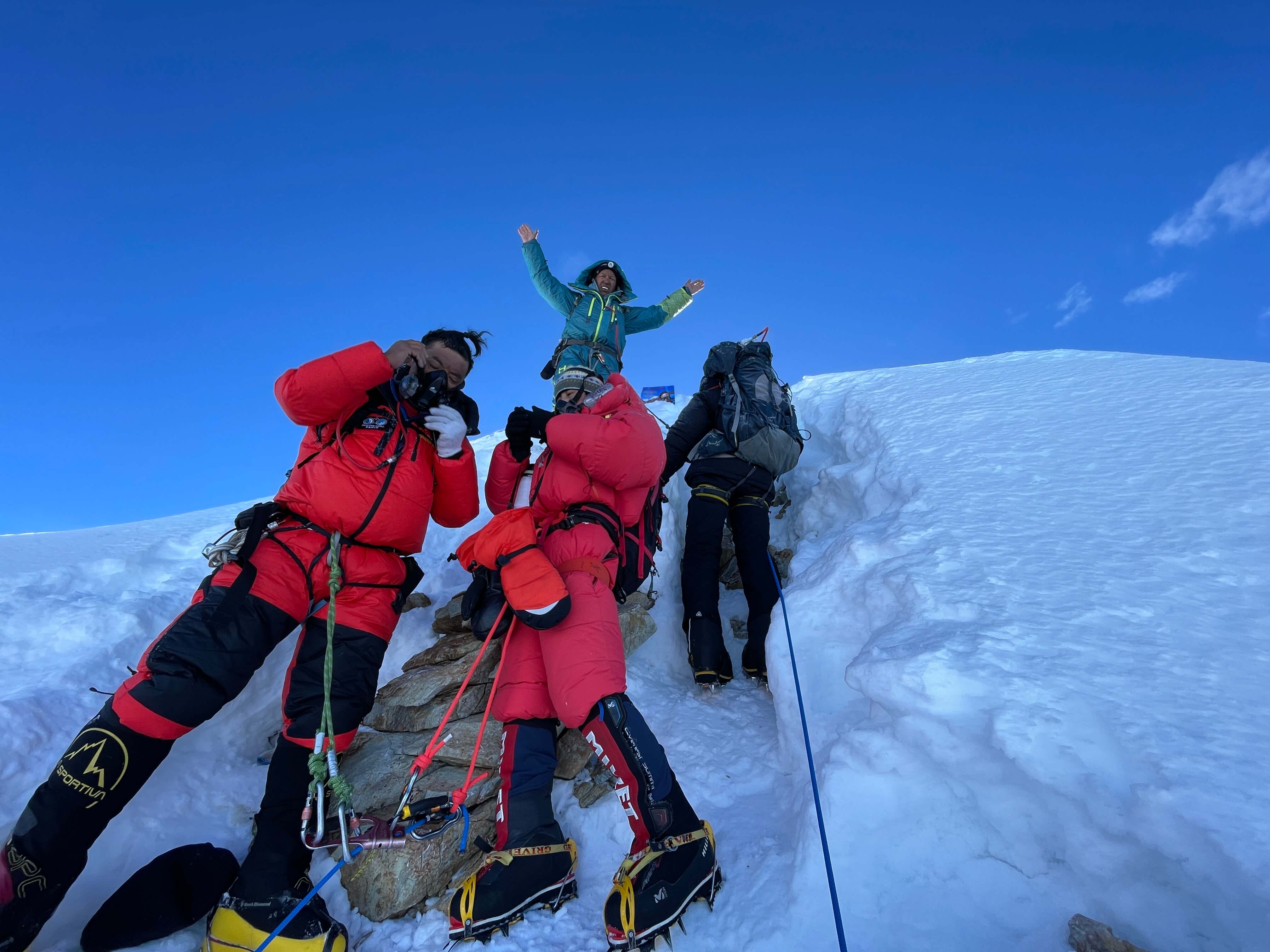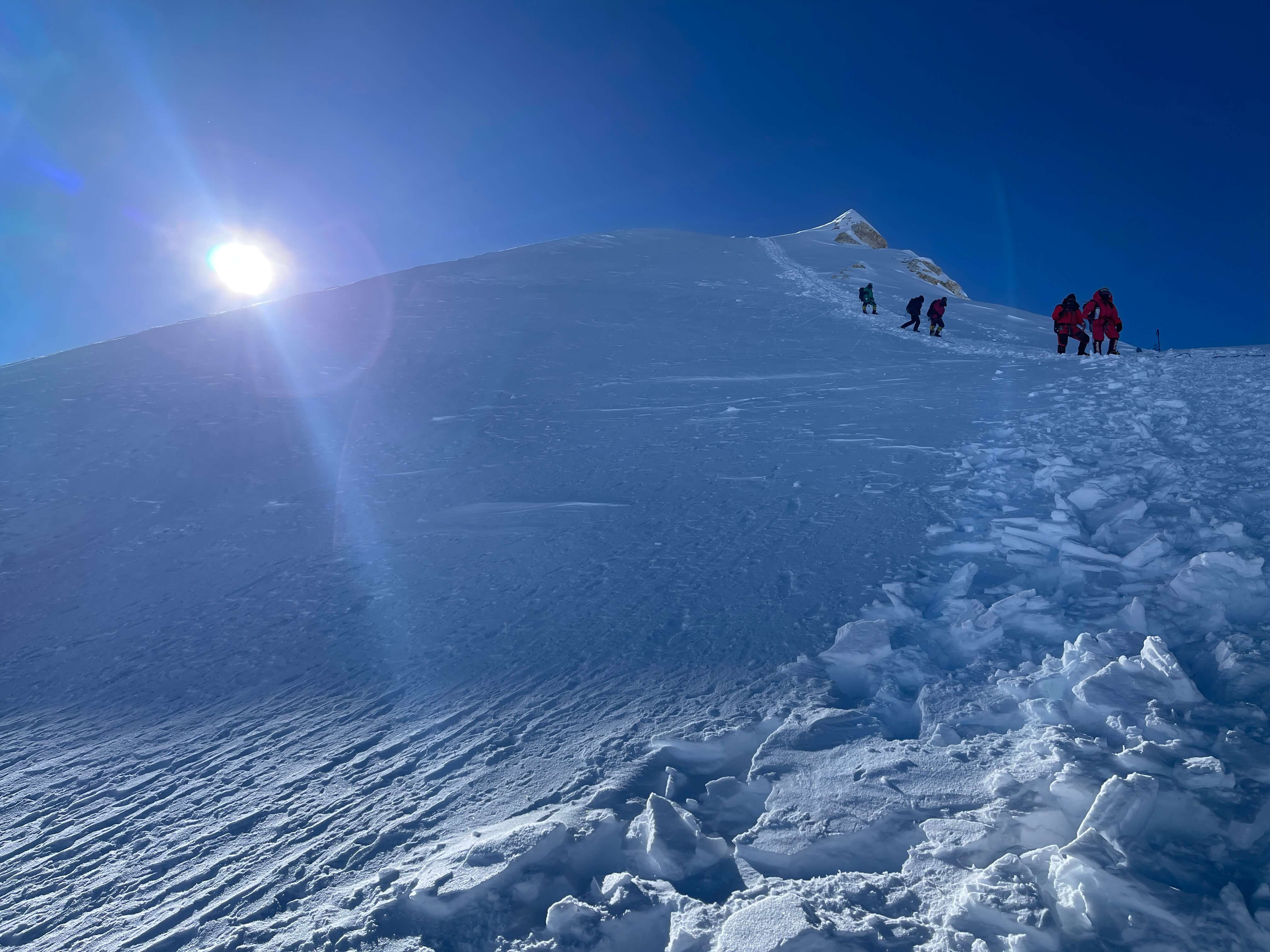 Sunrise brought a burst of energy and enormous stoke.  We were already at or close to 8000m when the sun hit, and the morning light brought both warmth and a clear view of the route to the top.  Other Imagine Nepal clients, new friends whom I had shared many meals with in basecamp, were descending from the summit, and we met at dawn below the final fixed ropes.  They offered encouragement, and were proud to see me climbing without o2.
