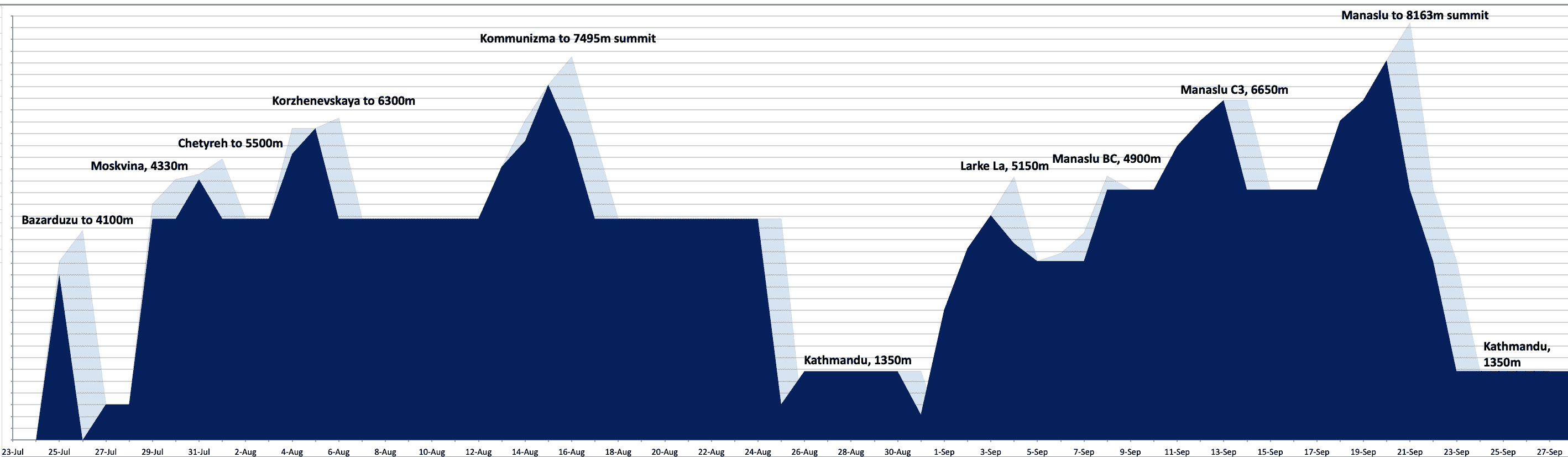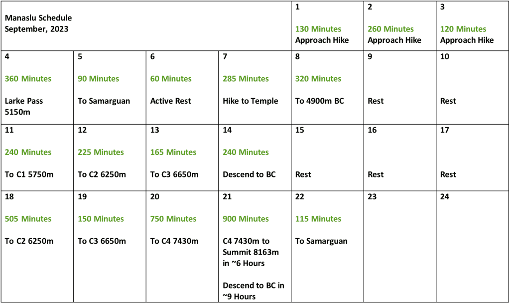 My complete acclimation schedule, including Manaslu’s summit, is visualized below.  Dark blue shows sleeping elevation, and light blue indicates the daily high point: