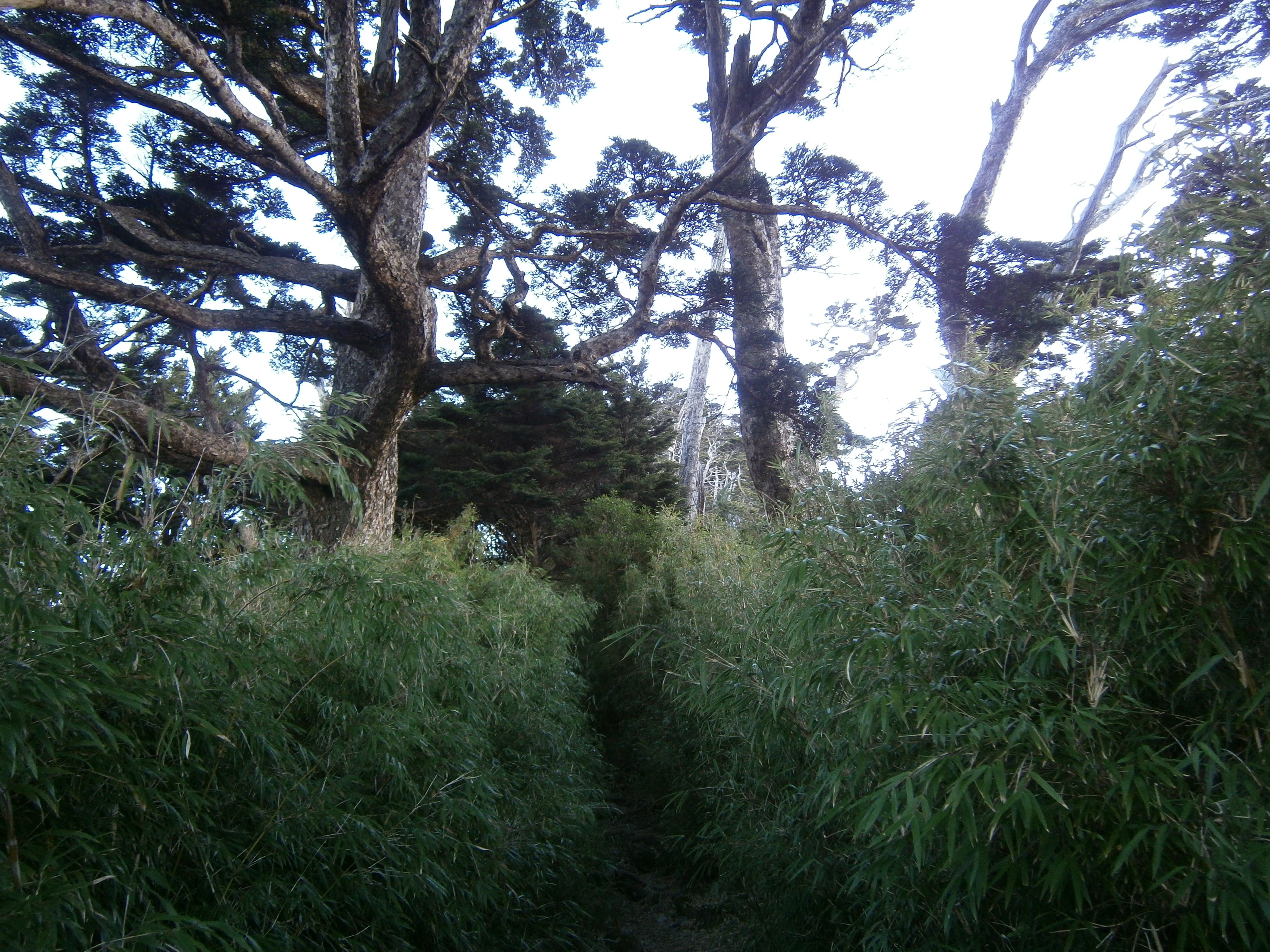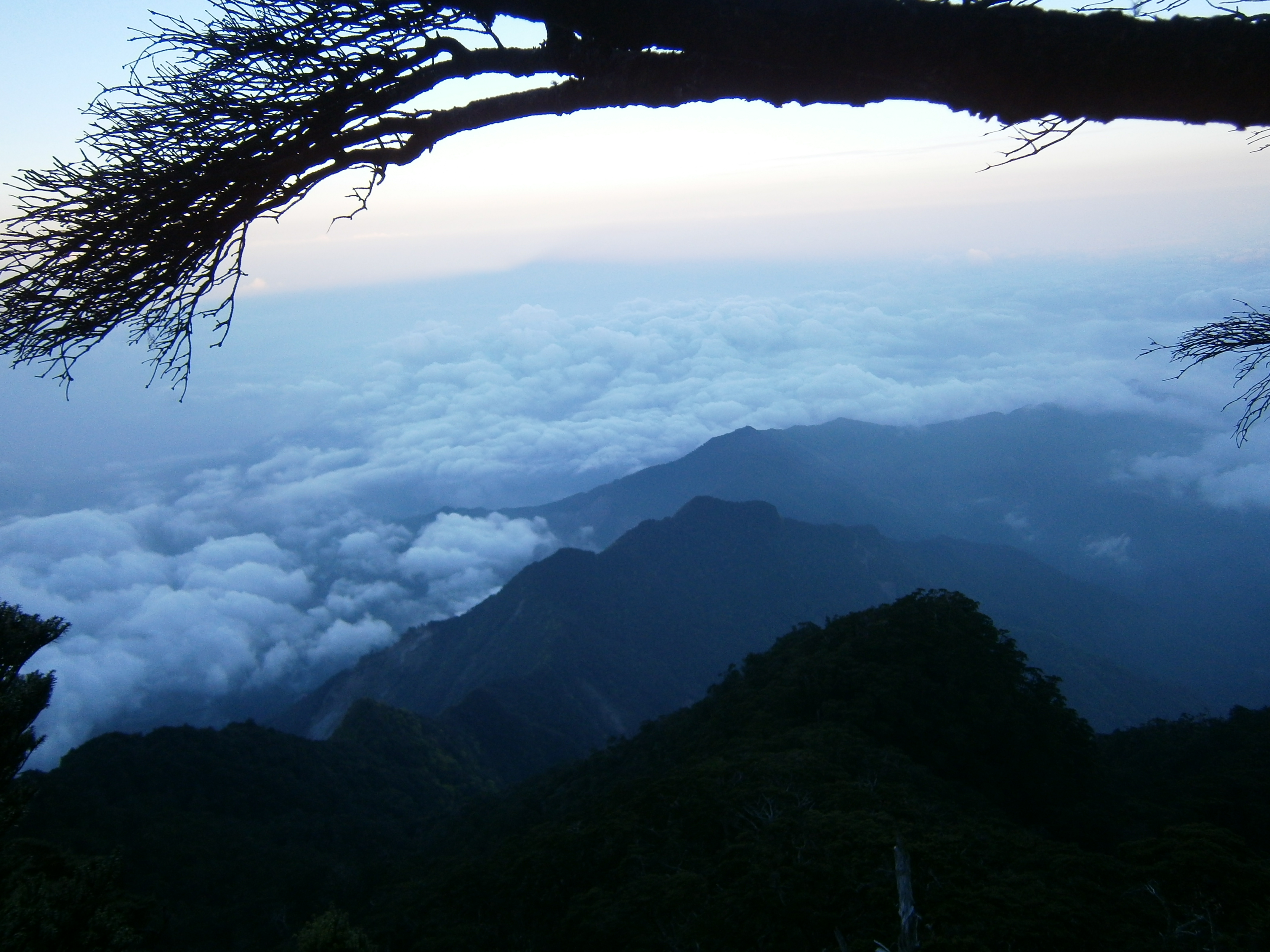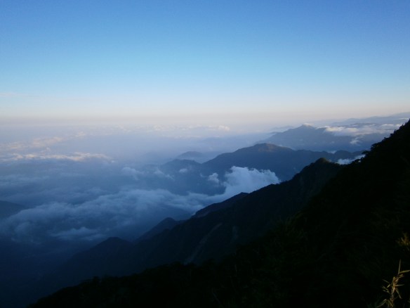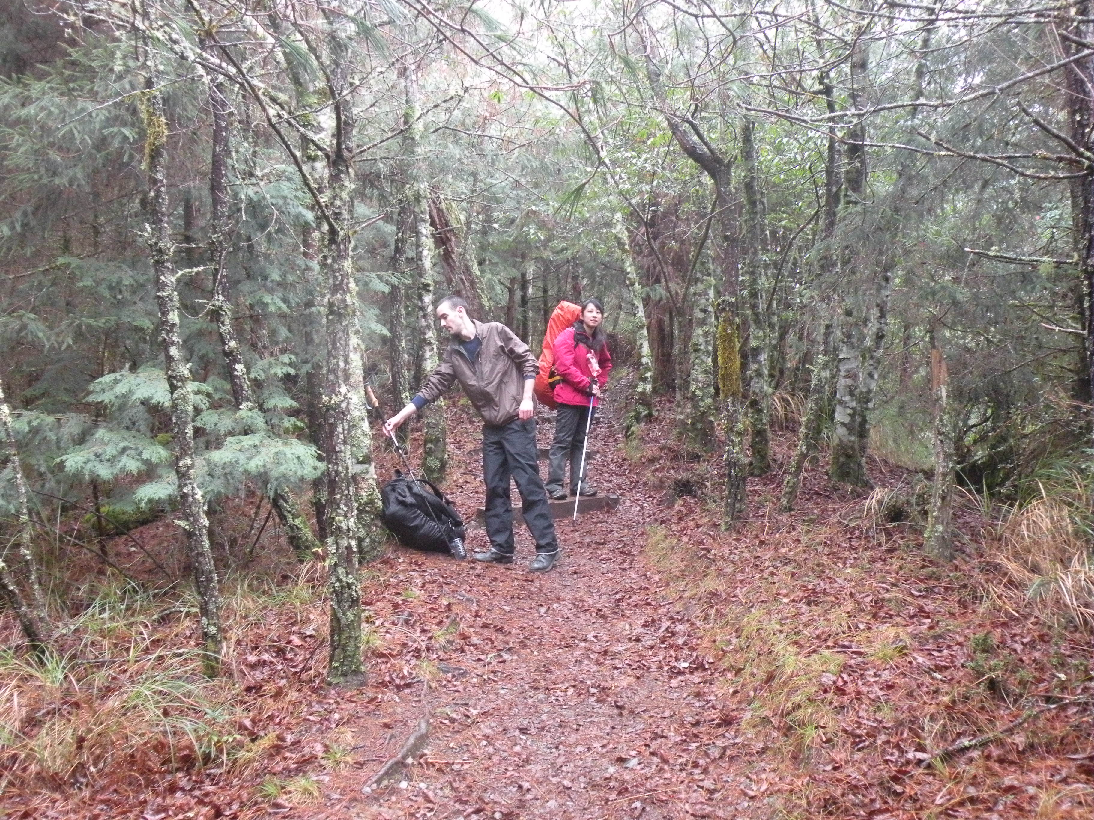 Back at the first trail split, on the ridge which leads to the Yunling cabin and Nanhuda Shan, I was delighted to find a perfect, clear view into Syue Ba National Park. Zhongyangjian Shan, unfortunately, remained cloud covered and was not visible to the south. On the ridge I met a pair of hikers headed for Nanhuda Shan, the first people I’d encountered in three days.