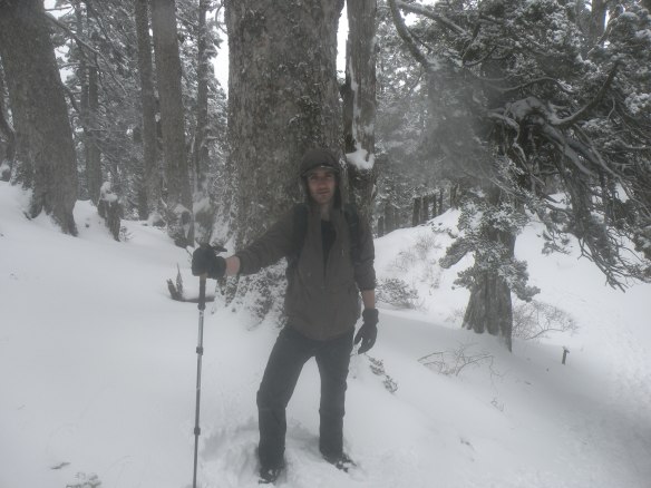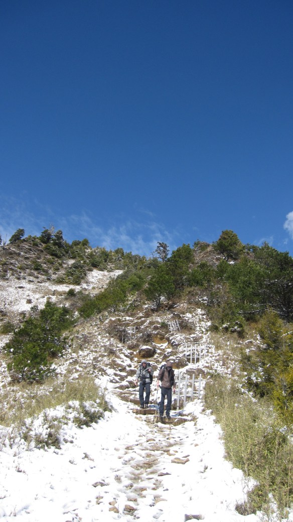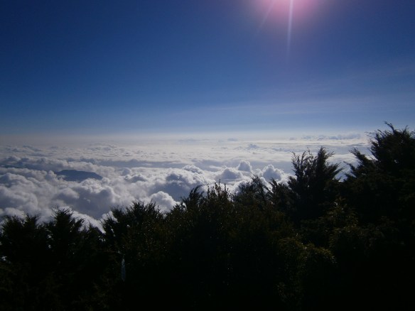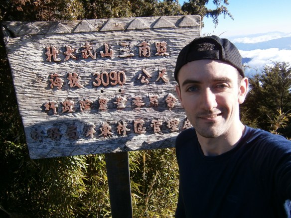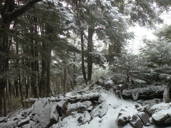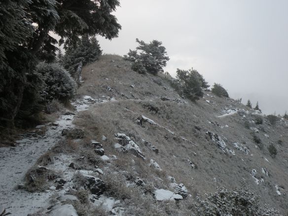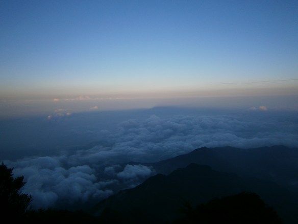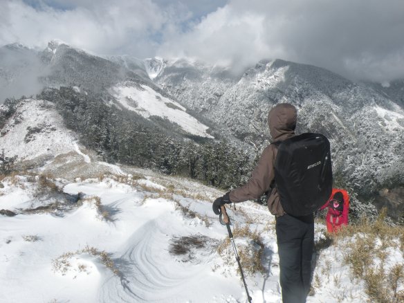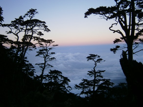 Back at the first trail split, on the ridge which leads to the Yunling cabin and Nanhuda Shan, I was delighted to find a perfect, clear view into Syue Ba National Park. Zhongyangjian Shan, unfortunately, remained cloud covered and was not visible to the south. On the ridge I met a pair of hikers headed for Nanhuda Shan, the first people I’d encountered in three days.