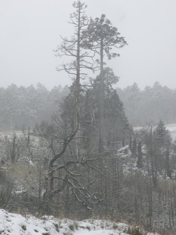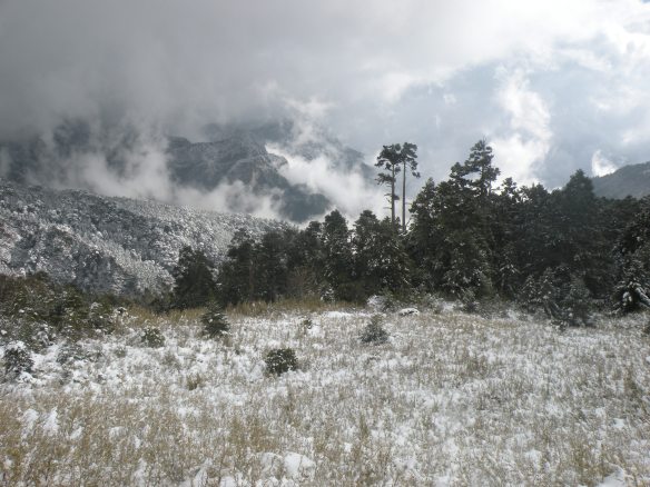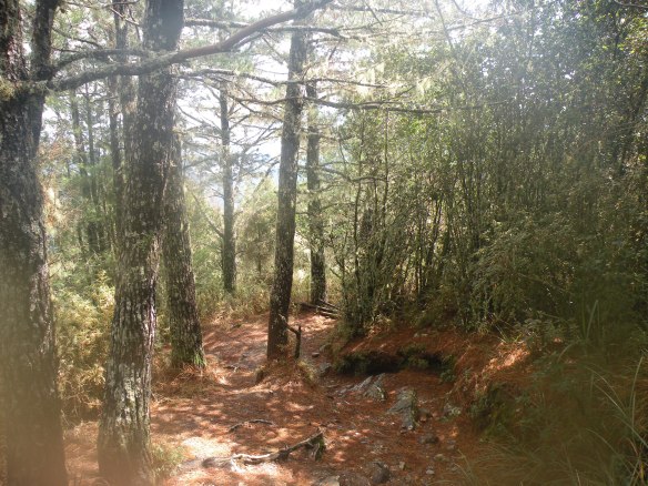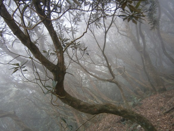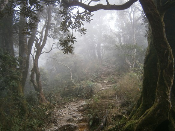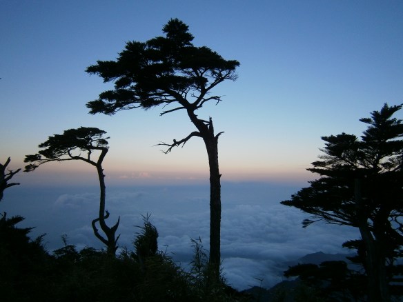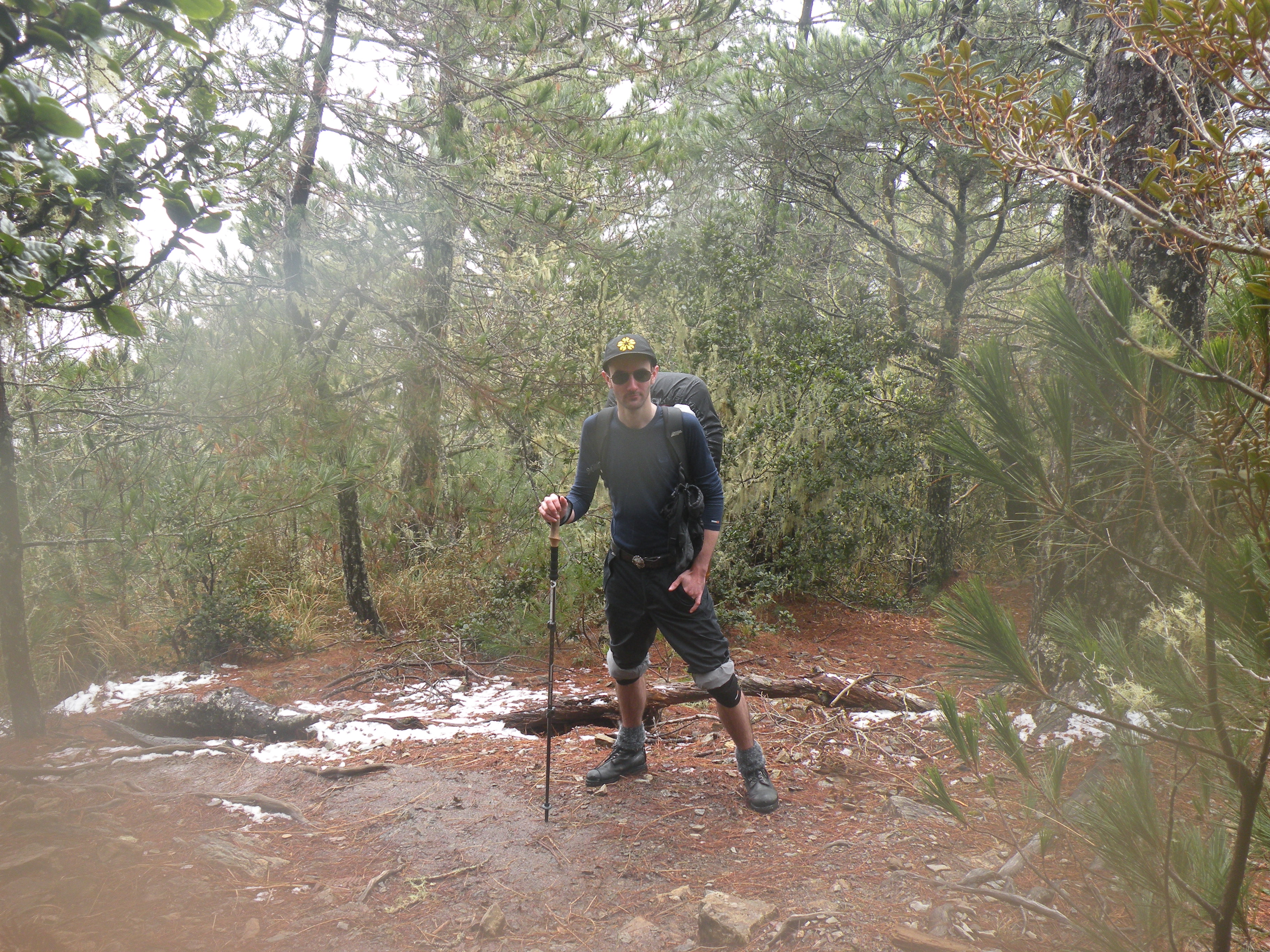 The landslides made this portion of the route grueling and seemingly endless – with my heavy pack, it took several hours to get through it. After this first section I reached the ‘old trailhead’, a large clearing with a drop box for permits and space for several tents. A switchback trail heads upwards, eventually breaking onto a ridge which continues to a junction in the trail. Here a separate path breaks south towards Zhongyangjian Shan. One can continue to the Yunling cabin and Nanhuda Shan, or split towards the Nanhu river cabin (南胡溪木屋) and Zhongyangjian Shan. Clouds over Zhongyangjian Shan obscured the view, although this area is one of the best vantage points of the mountain.