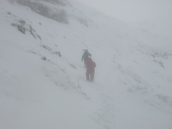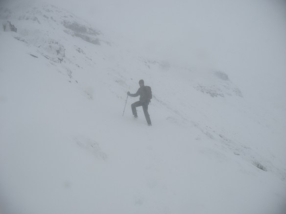 Ahead I could see the mountain through brief gaps in the clouds churning overtop. The river tapered off, replaced by a moderate slope of loose scree.