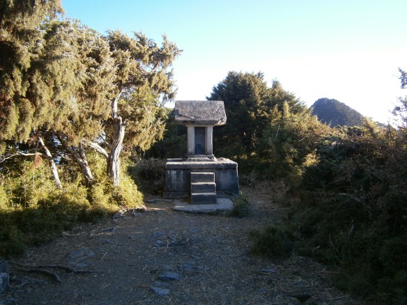 Eventually, the scree breaks onto the saddle between Zhongyangjian Shan’s main peak and east peak. Up here the ground is covered in grass and even some trees. As soon as I reached the saddle, clouds rolled in and a light drizzle began.