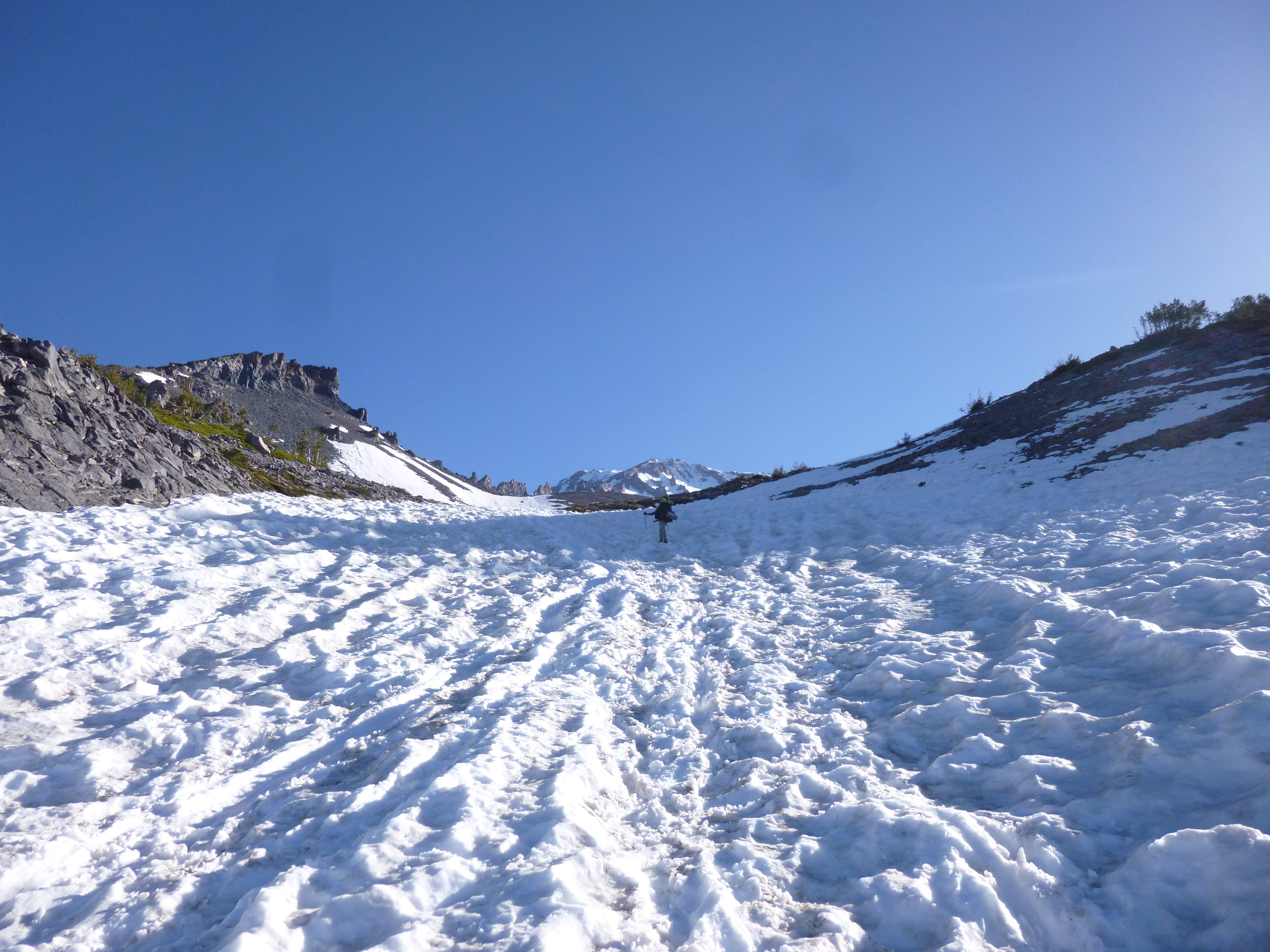 Looking back at the bergshrund, it is visible as a long crack along the length of the right-hand ridge.