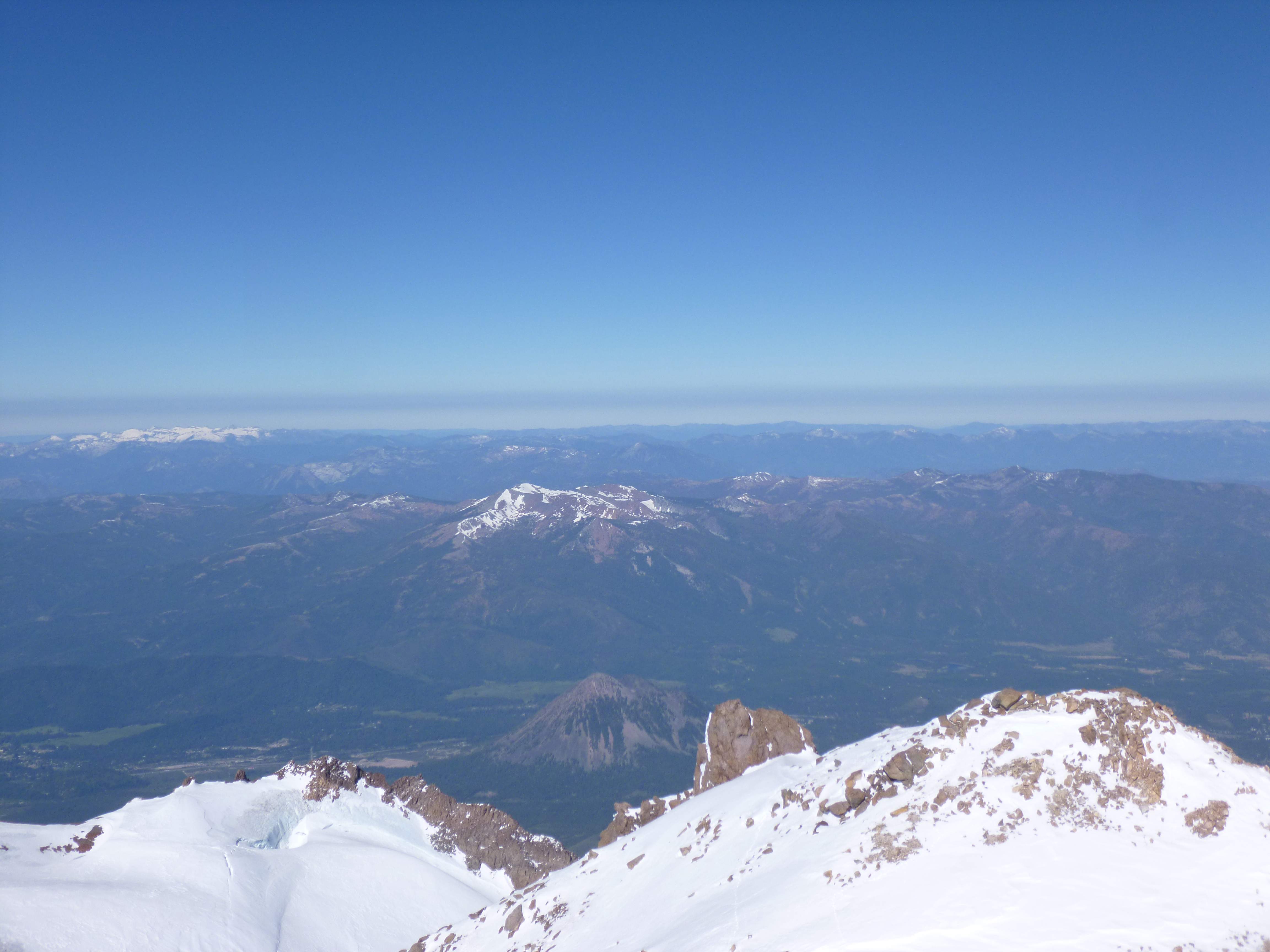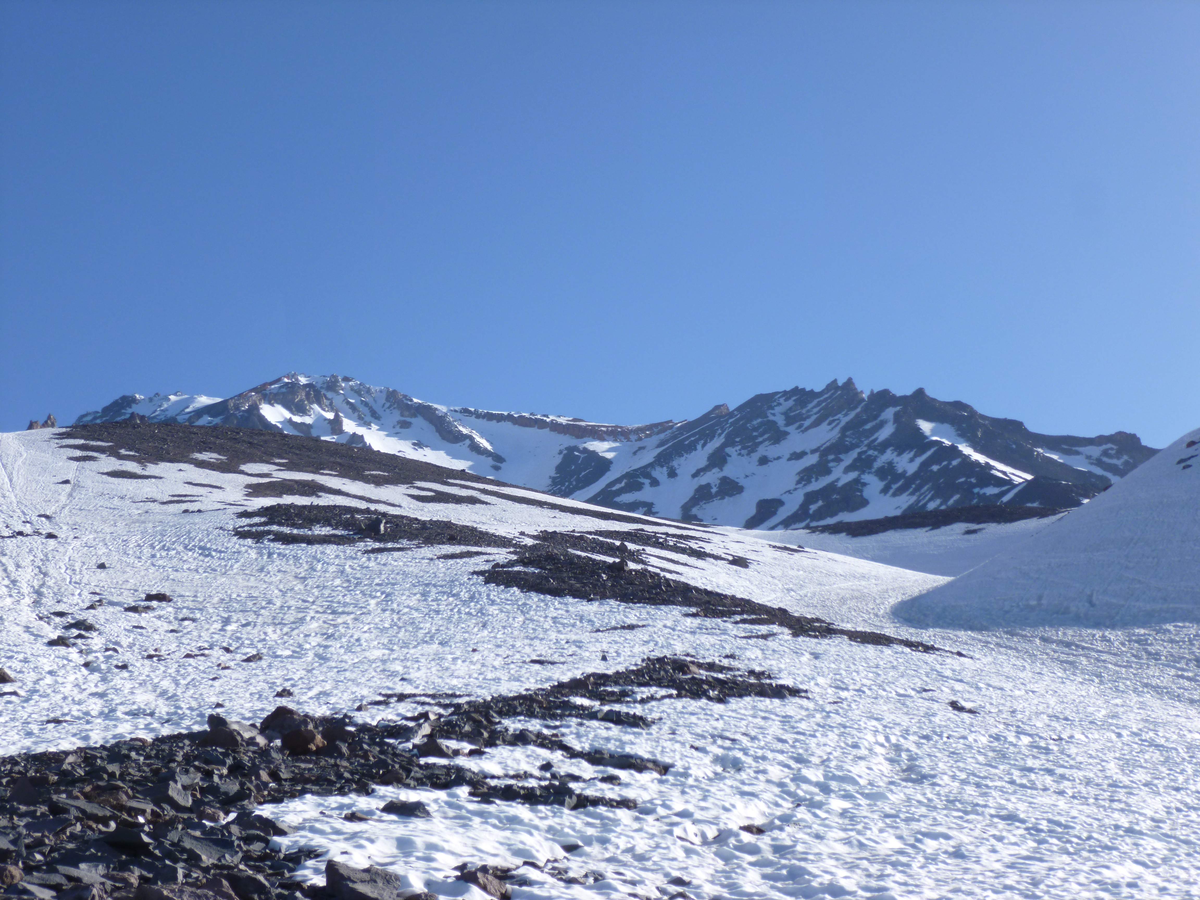 The weather was still excellent. We were extraordinarily fortunate, encountering very low wind and clear views the entire way up. The clouds began to rise quickly as we approached the top, and Columbia Crest came into view above us.