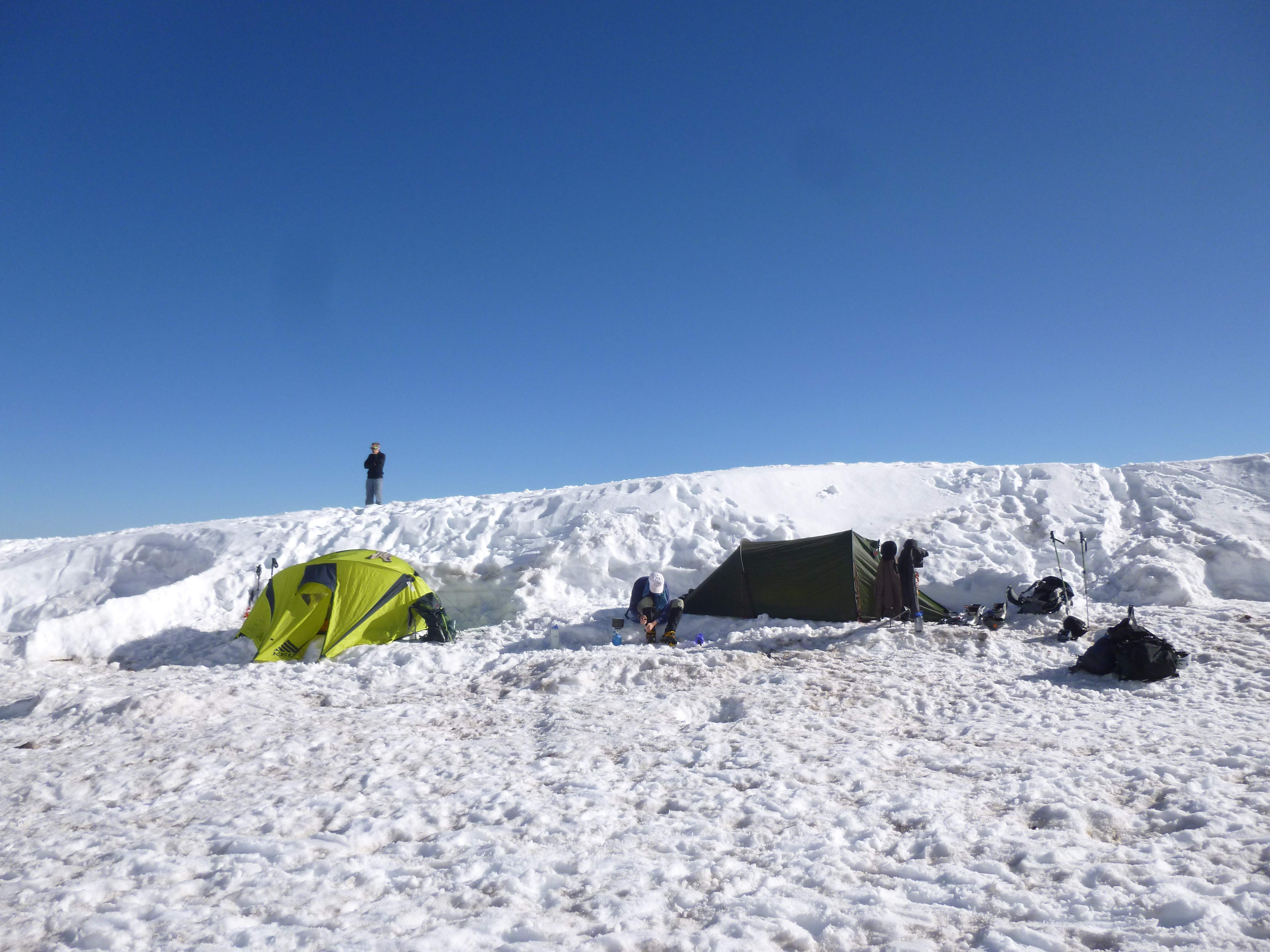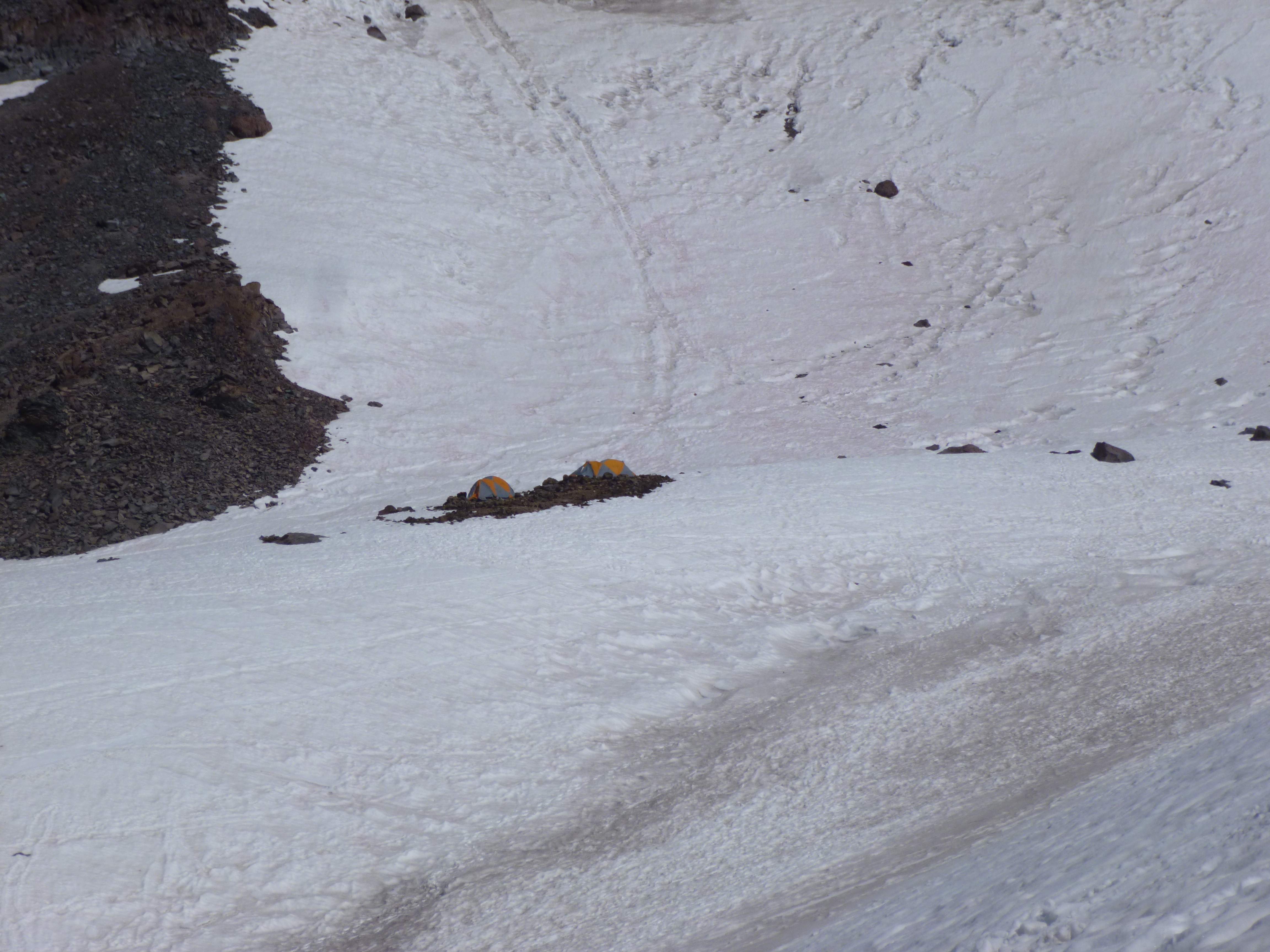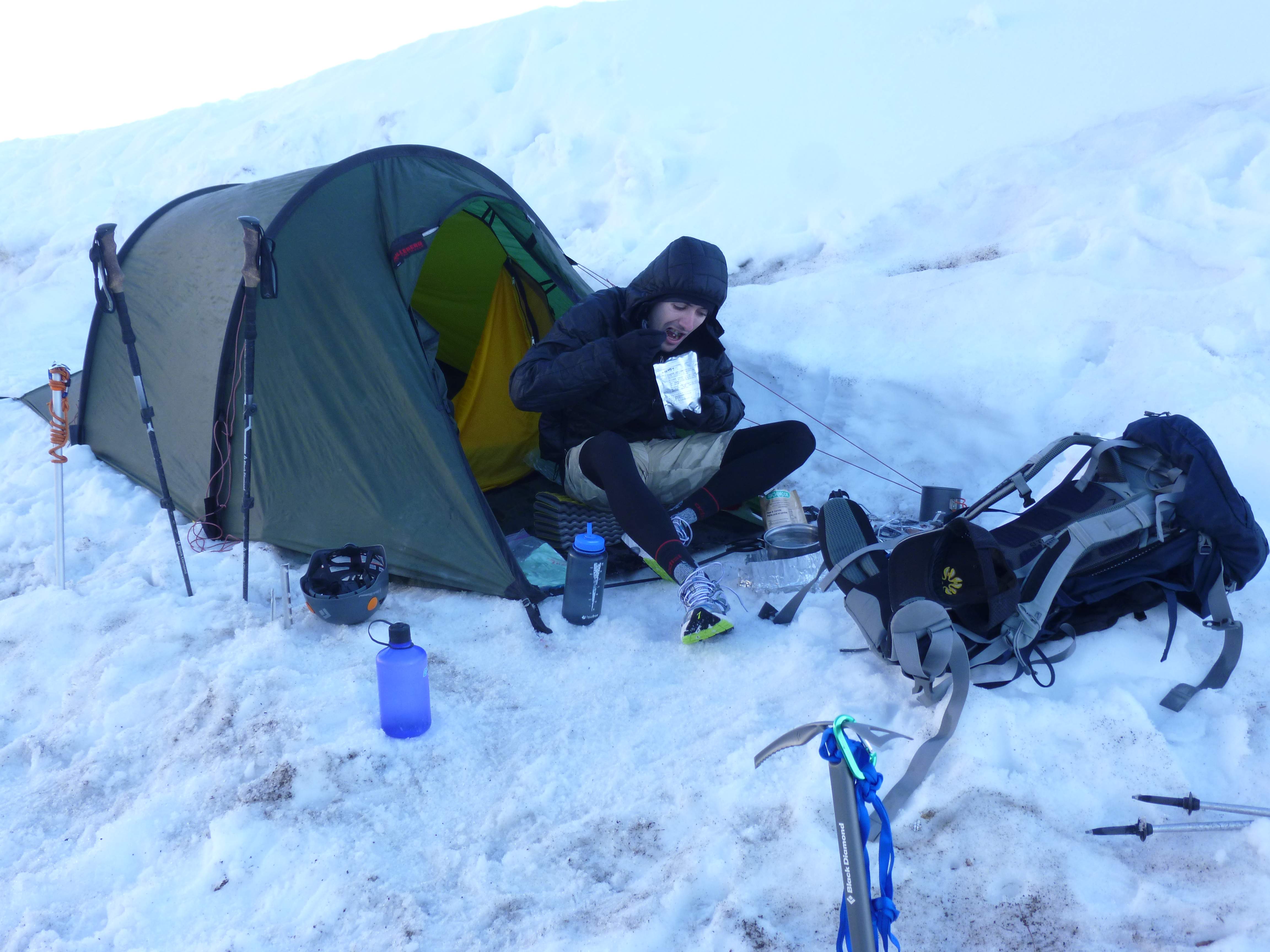Shortly after our return to camp a steady rain began to come down. It was cold, wet, and thoroughly unpleasant – we were all grateful that we had been lucky enough to ascend in clear weather. As the sun began to set, the rain turned to sleet, then snow. From here on our itinerary was very relaxed, and our plan didn’t call for descending until the next day. We turned in early, planning to get a sunrise start.