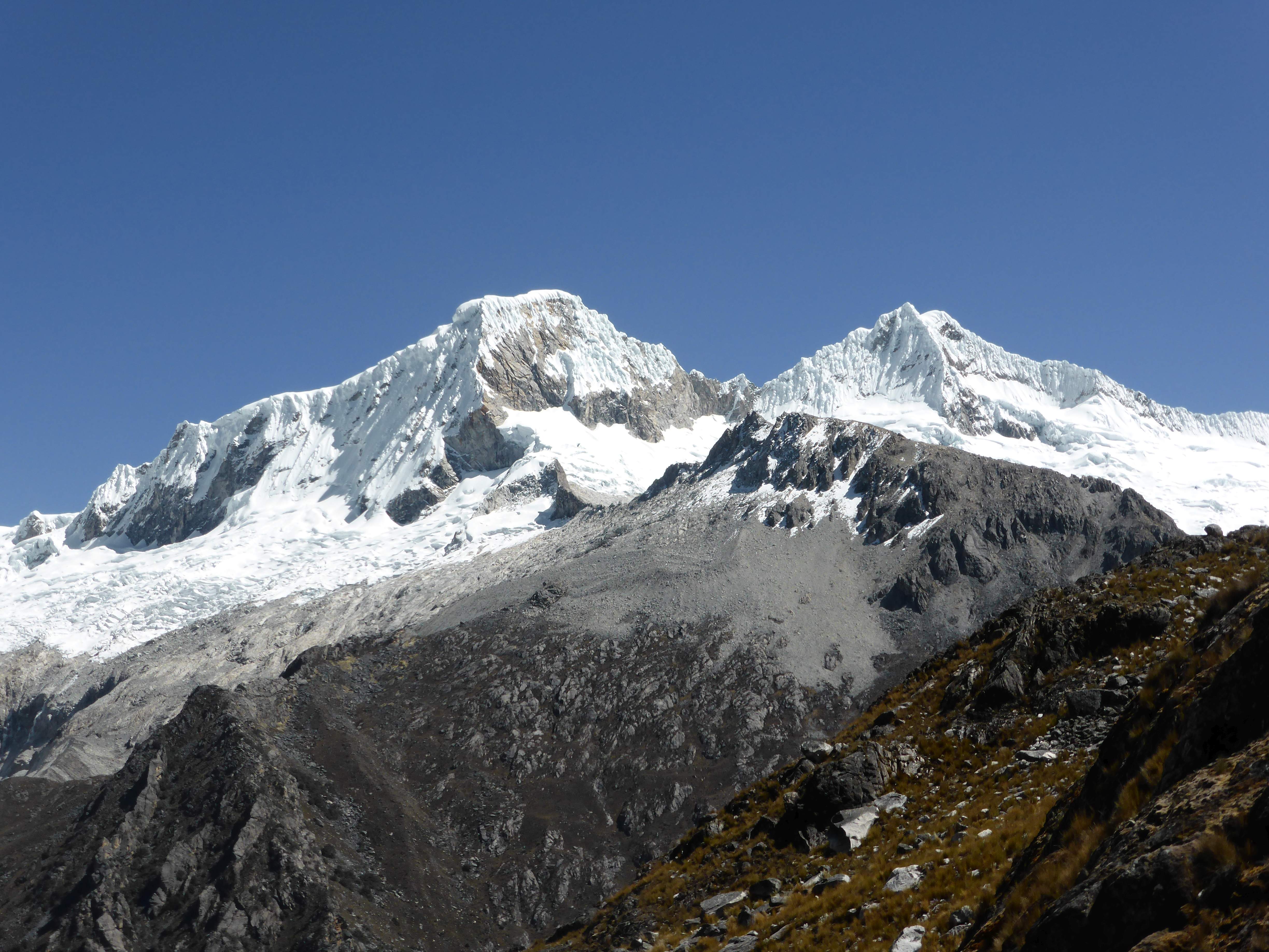 Chopicalqui, Huascaran Sur, and Huascaran Norte high above the Quebrada Llanganuco, as seen from the Yanapaccha approach access point.