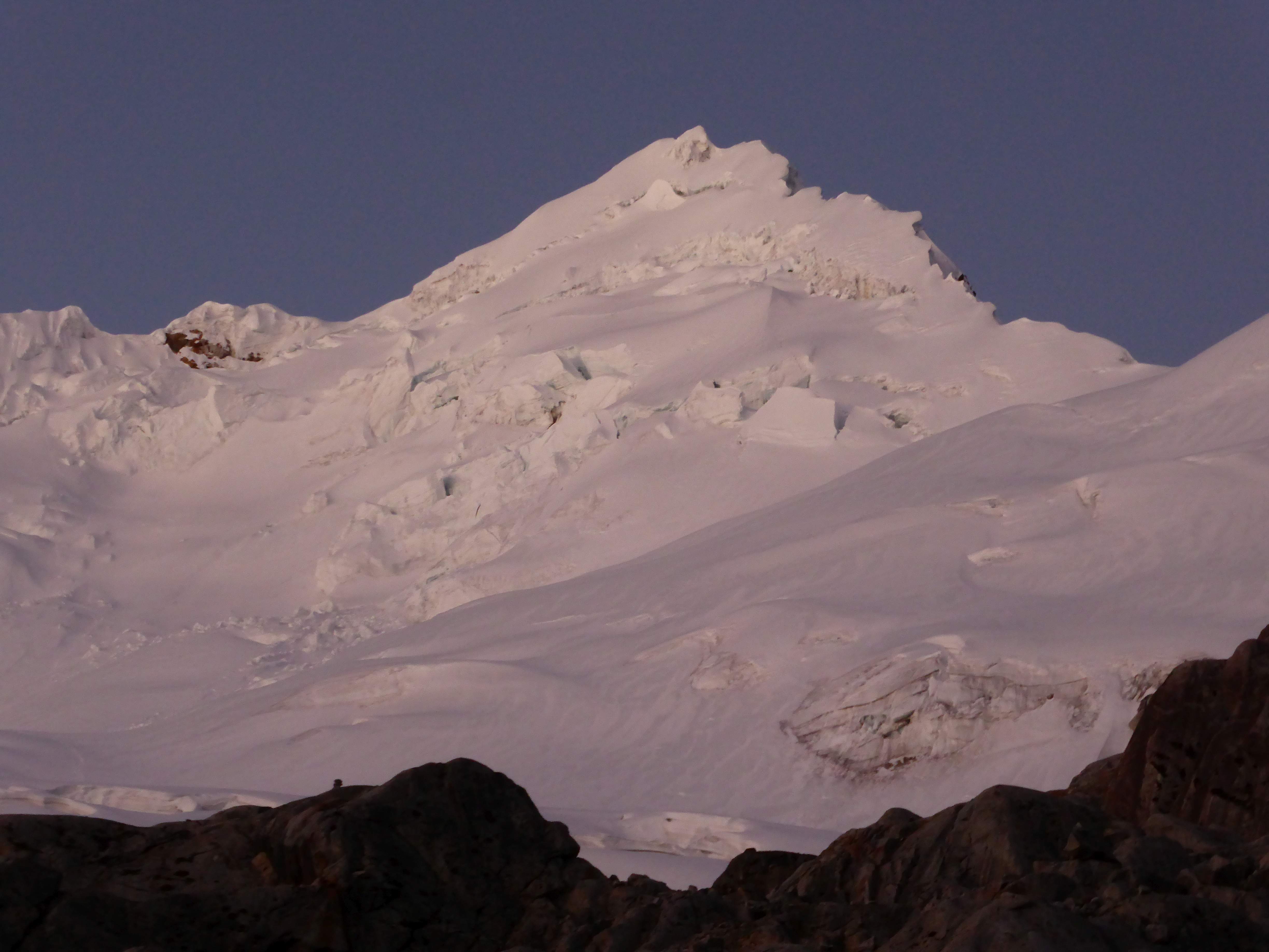 Day 2: We woke up at 1:00, and were moving upwards by 2:00. From the moraine camp a short 15 minute scramble took us to the base of the glacier, where we put on crampons and roped up. The entry to the glacier involved a ~5 meter ~60 degree wall of thin water ice – a fine start to the climb! The lower glacier took us across moderate slopes before becoming more complicated. The boot track took us across a sketchy snowbridge, which we protected, and along a steep traverse below the summit pyramid before we reached the first of three pitches. It was very cold, and a light wind gave cause to layer up with my down parka and thick mitts. We favoured the ridge of the summit pyramid rather than an ascent directly up the face, due to a large crevasse open in the middle of the steep slope. We climbed steadily and with purpose on belay, using snow pickets as anchors along the ~60-70 degree ridge. The final pitch was interesting, with several medium-sized crevasses splitting the slope and creating short but technical vertical steps.