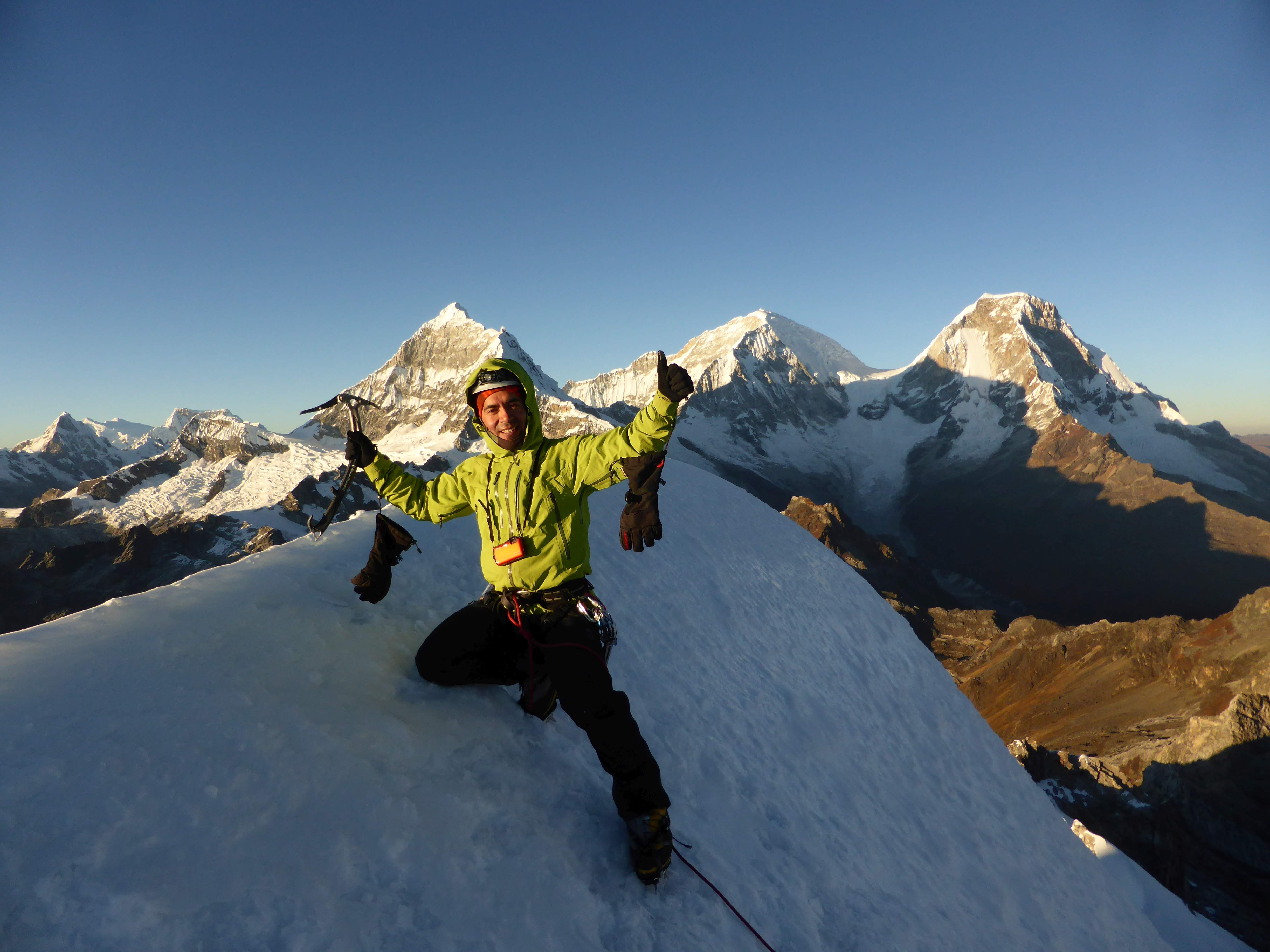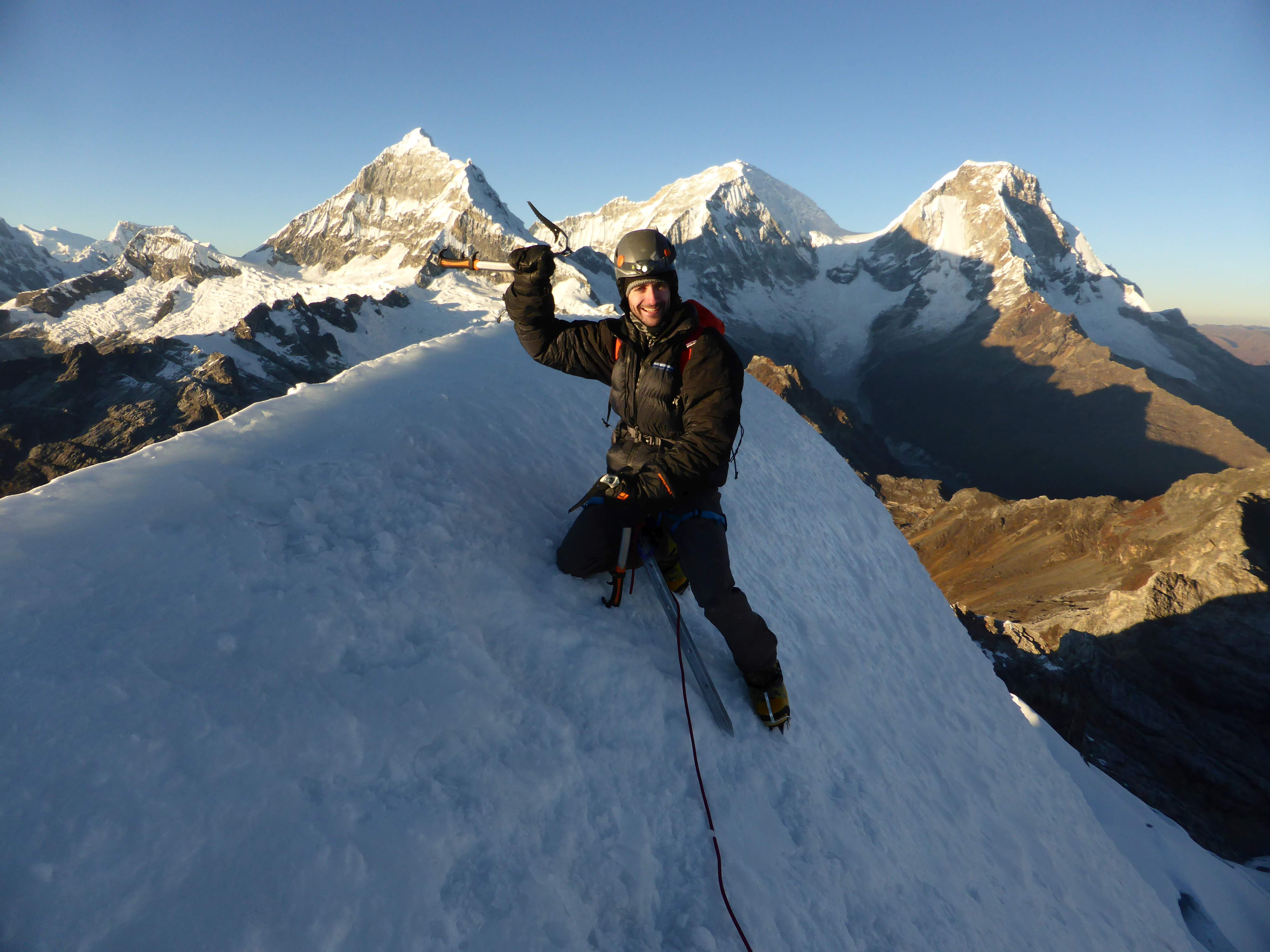 Soon we broke through a small cornice, and after another 10m of climbing reached the summit at 6:30 a.m., four hours after leaving our tent – and what a summit! The views from the top of Yanapaccha were nothing short of gorgeous. The Huascarans, Chopicalqui, the Huandoys, Chacraraju, and Pisco rose around us, and we enjoyed excellent angles of view towards all of them.