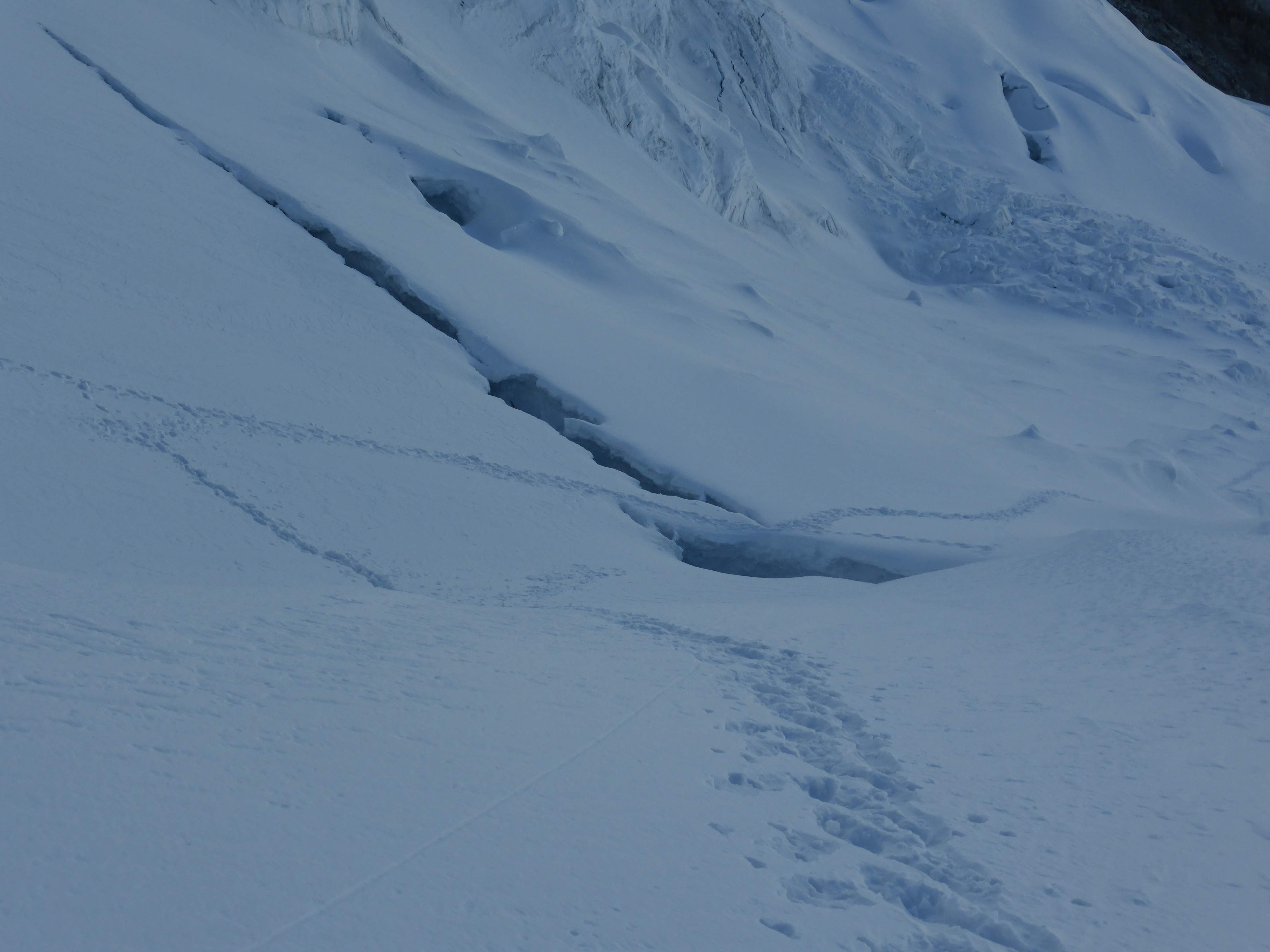 The thin, sketchy snowbridge we crossed on the lower glacier. We took the time to protect it carefully with a picket.