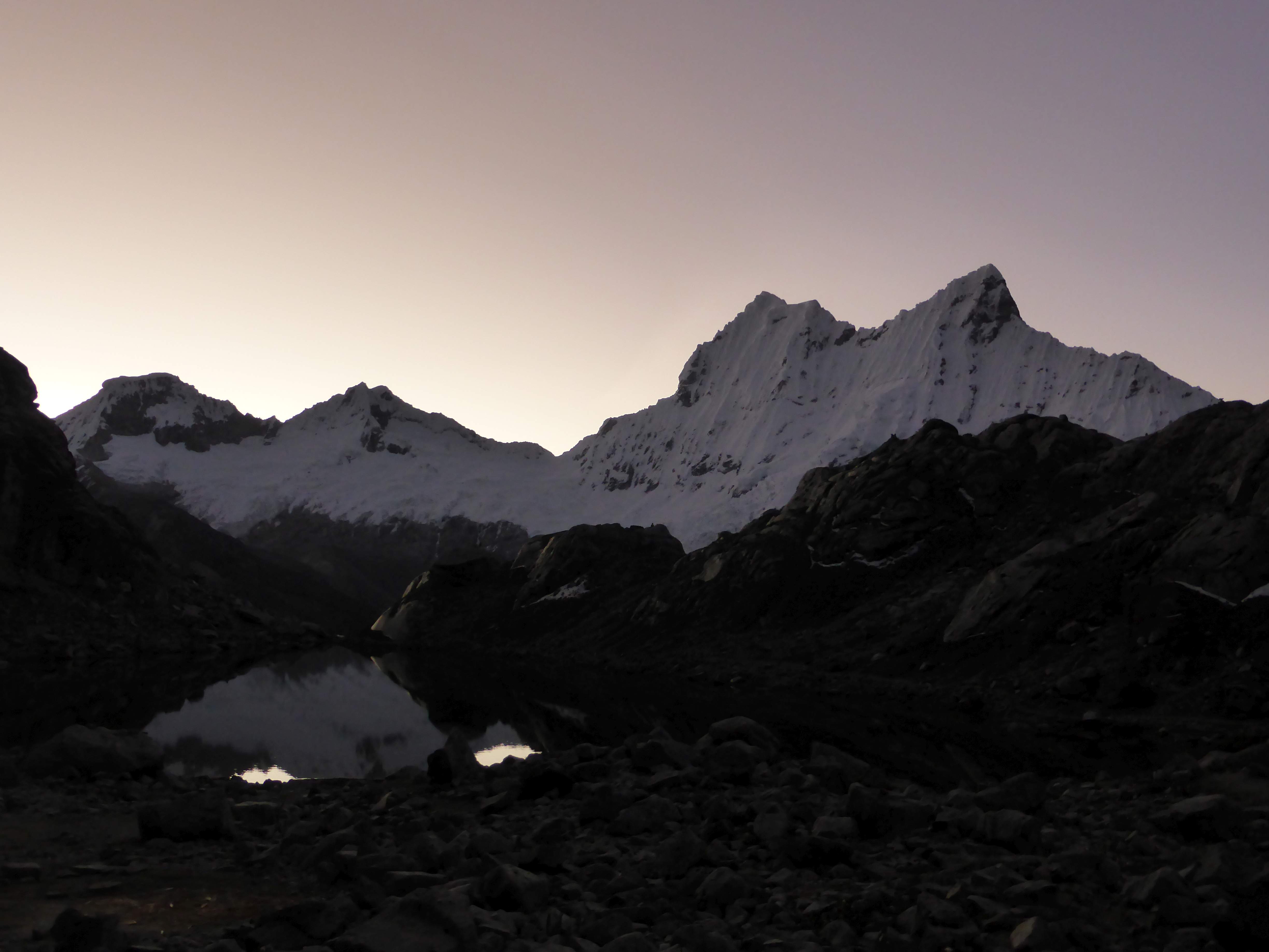 July Sunset happens early in Peru, so we quickly put up our tent and made dinner. After dinner I spent some time socializing with a 6-person commercial team there to do an ice climbing and glacier skills course before leaving them to take photographs. The sunset cast lovely light over Yanapaccha, and highlighted Chacraraju and Pisco in the distance.